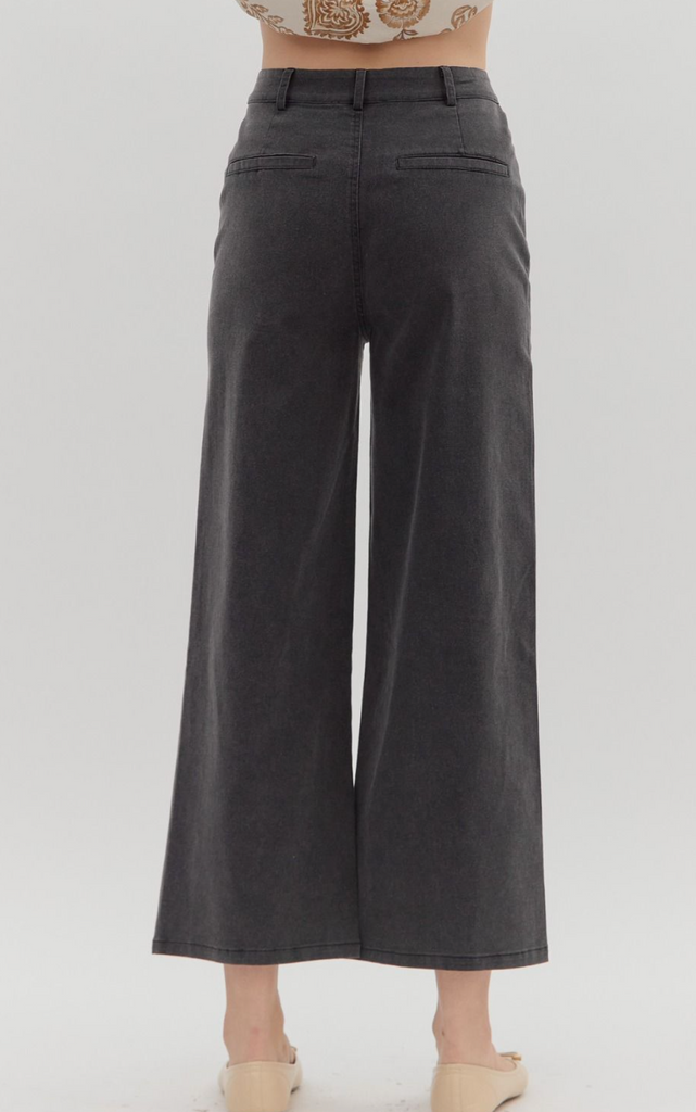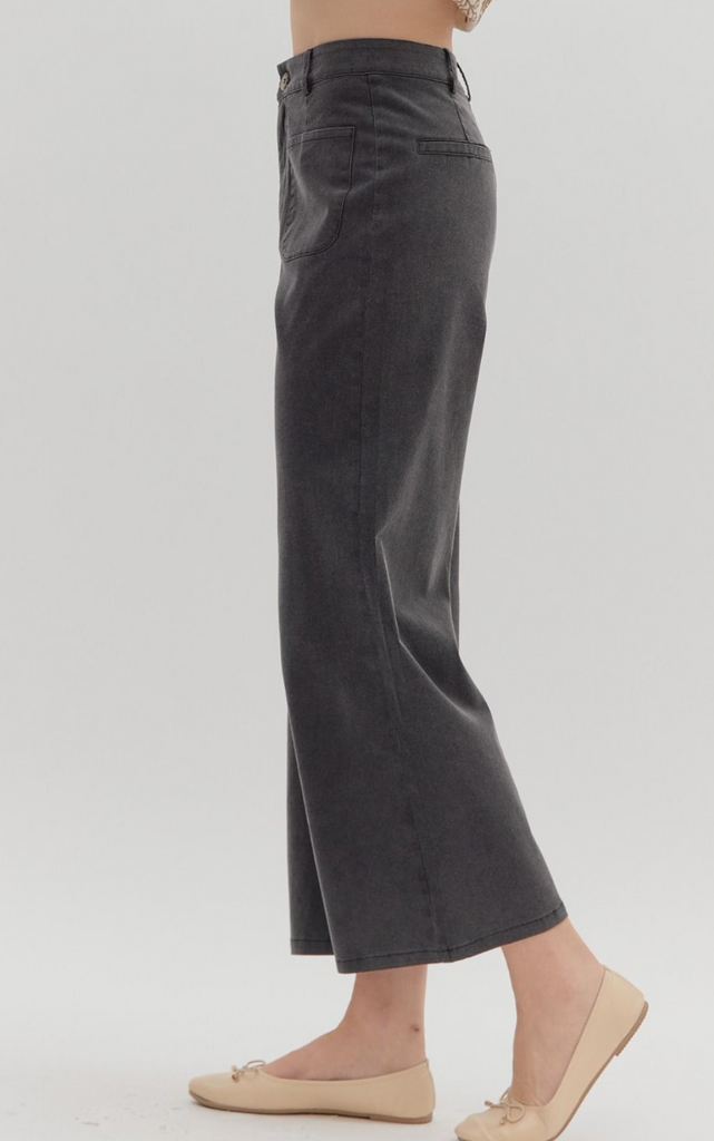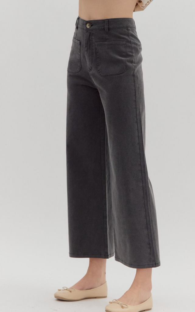 Solid high waisted wide leg ankle length pants featuring patch pockets at front. Faux pocket at back. Belt loops. Button and zipper closure at front. Unlined. Woven. Non-sheer. Lightweight.