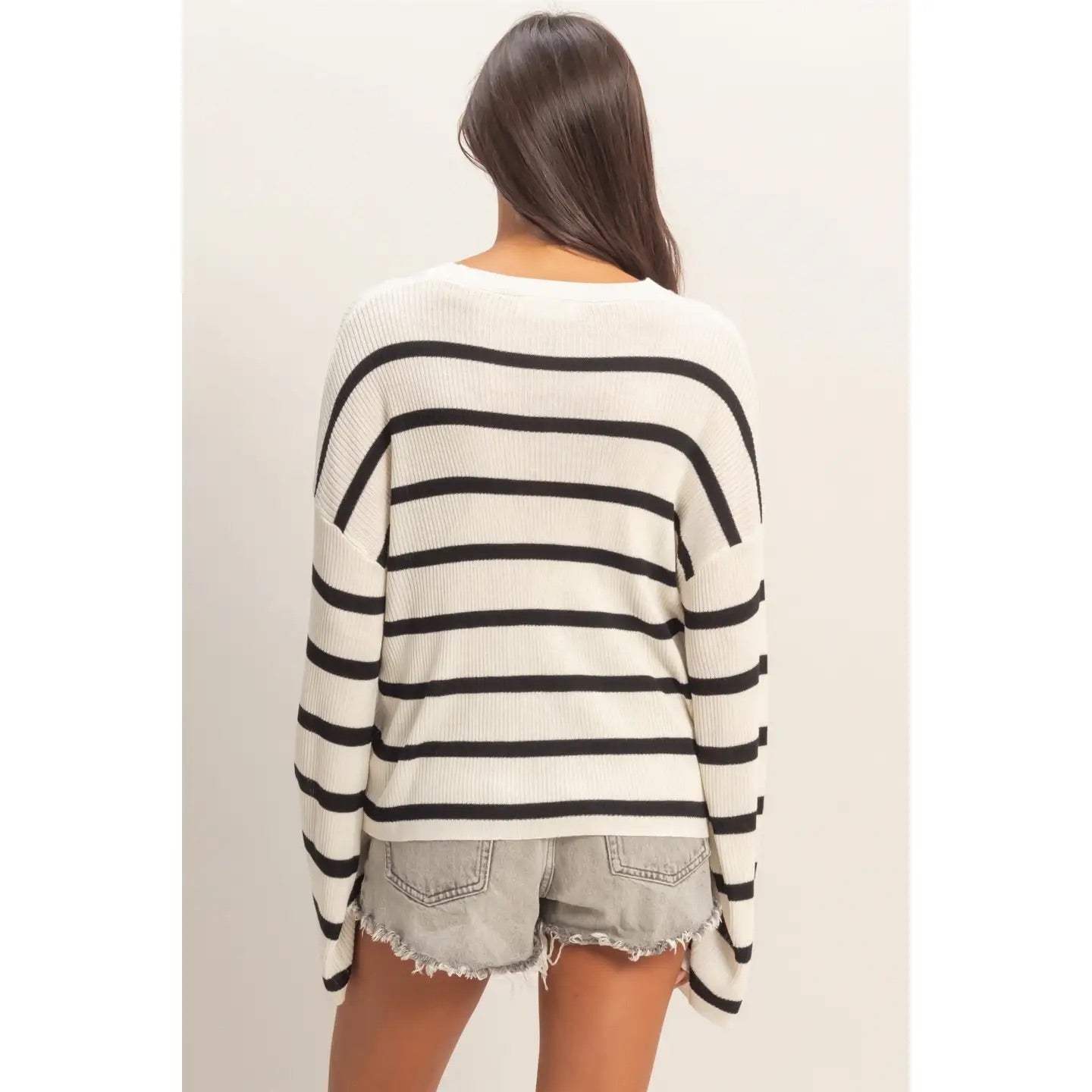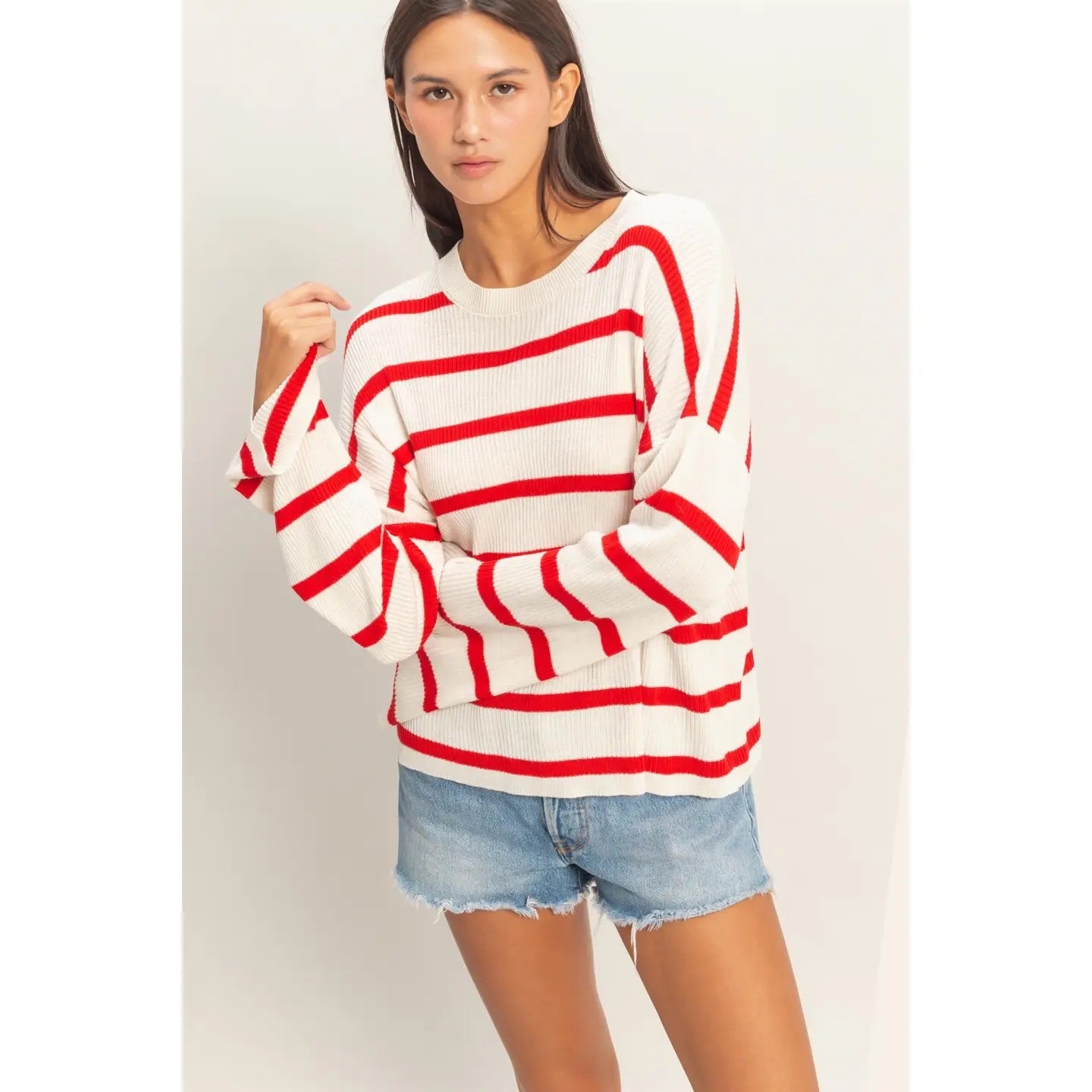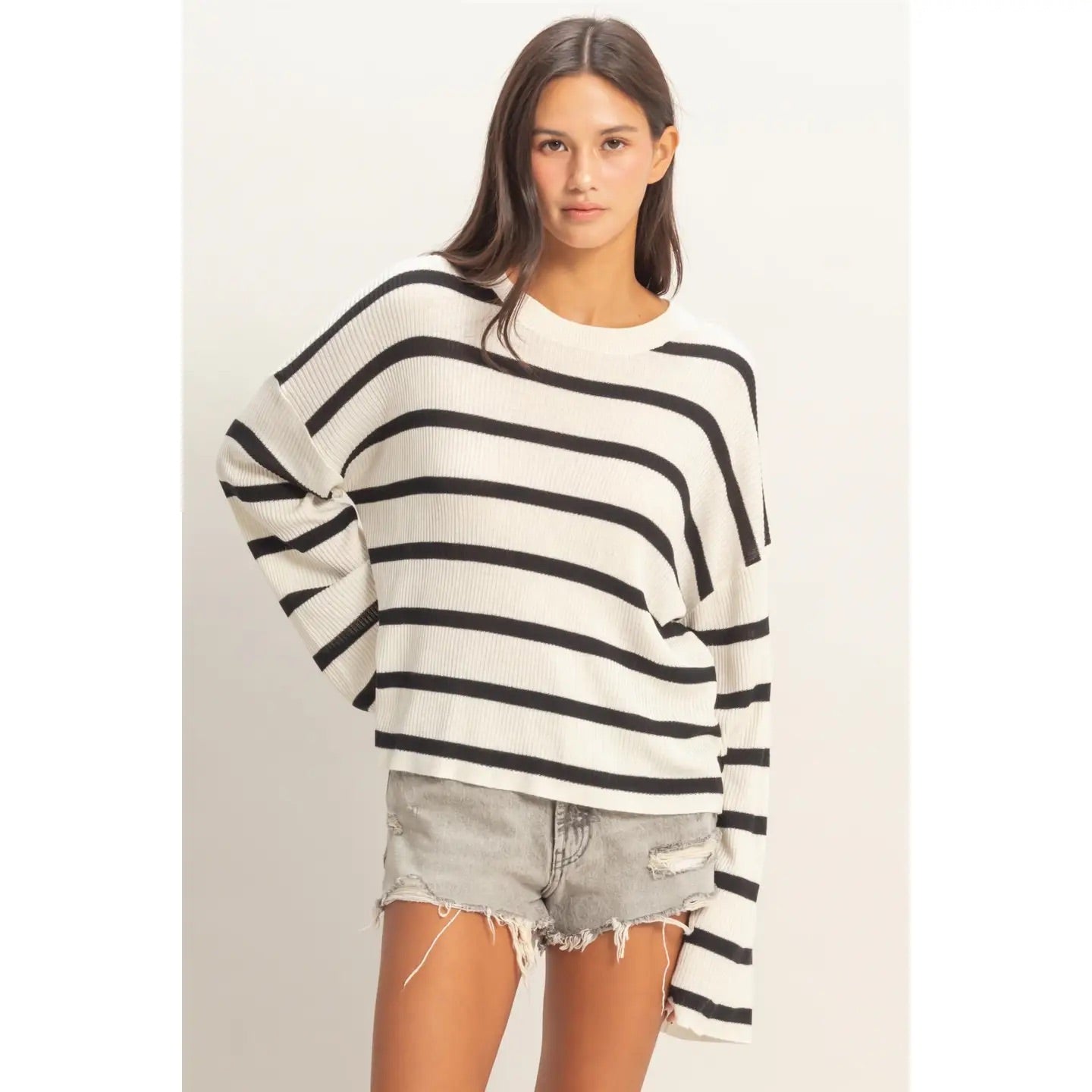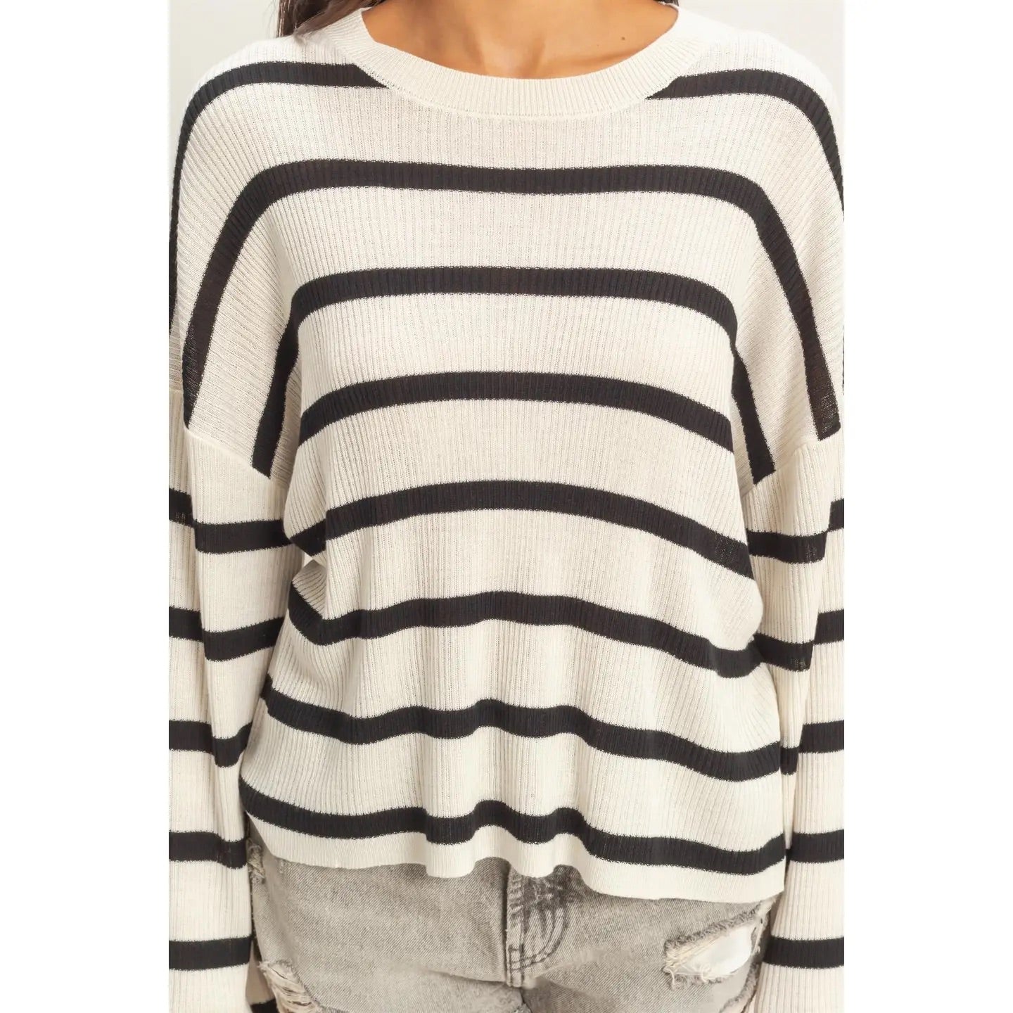 This lightweight essential pullover is created with a soft rayon and acrylic blend, featuring a vertical ribbed texture and bold horizontal stripes. The design includes a gentle crew neckline and roomy drop-shoulder wide sleeves. Cut in a relaxed fit, it pairs perfectly with a denim skirt and ankle boots for a casual weekend outfit. 50% Rayon 50% Acrylic Model Is 5' 7" Tall, 32" Chest, 23" Waist, 34" Hips And Wearing A Size Small Imported. Designed In The USA