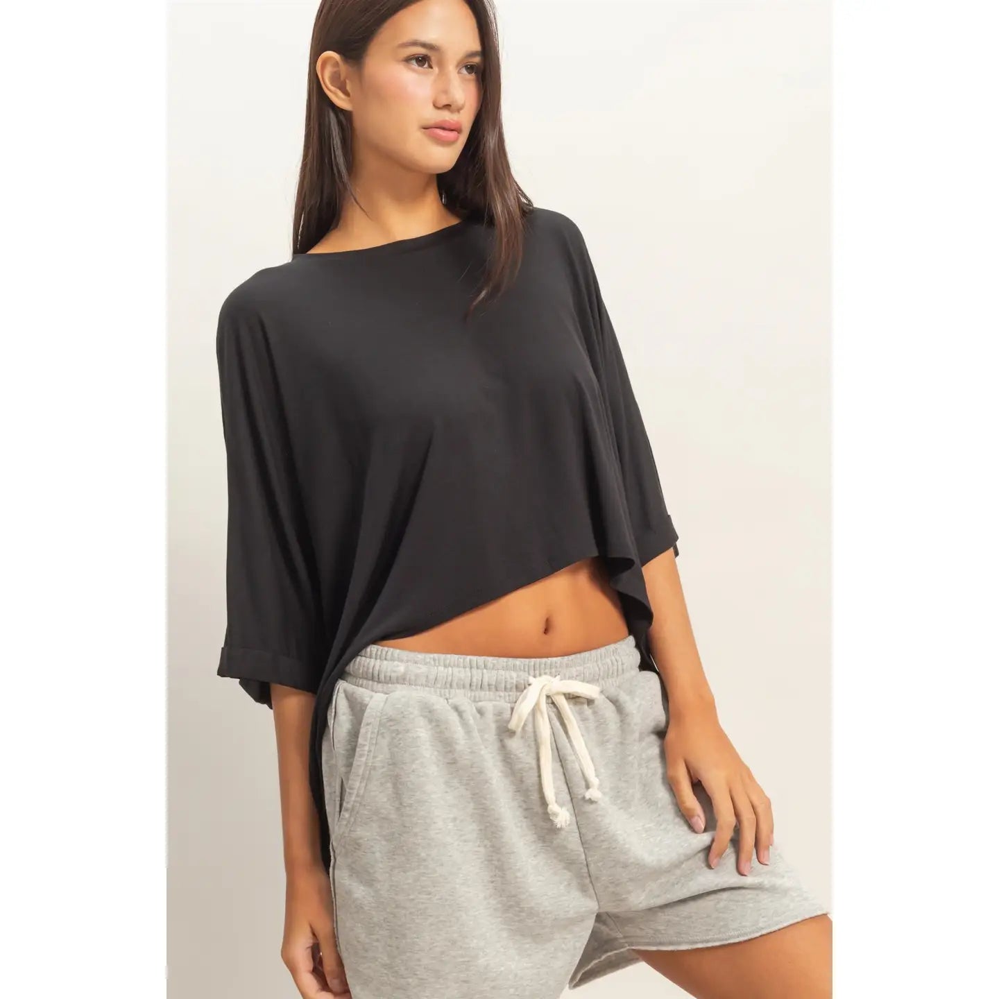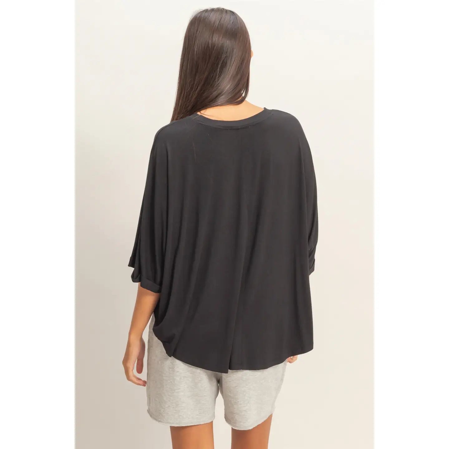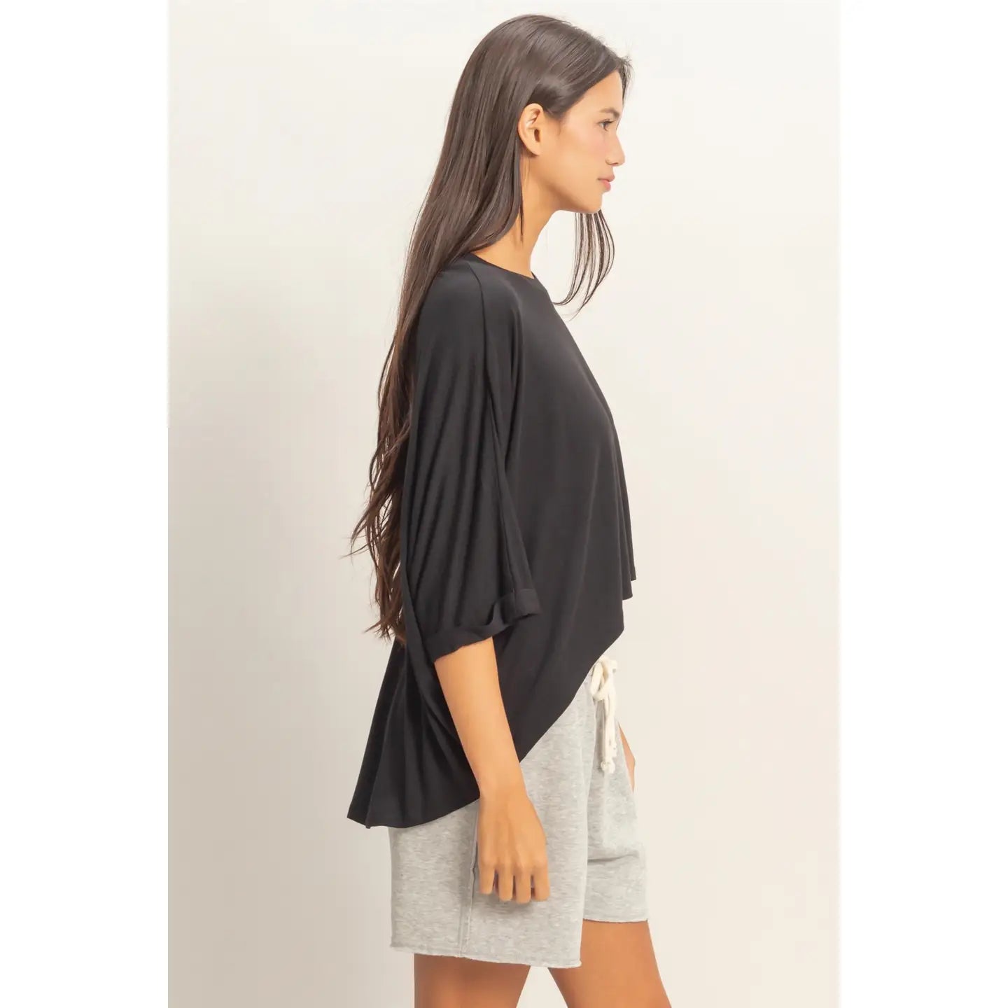 This top is crafted from a buttery smooth rayon-spandex jersey, featuring a gentle wide crew neckline, a vertical central seam in the back, and wide effortless dolman batwing sleeves with neat, tacked cuffs. Cut in a generous oversized, flowy fit with a high-low curved hemline, it pairs well with a high waisted skirt for a chic, laid-back style.
