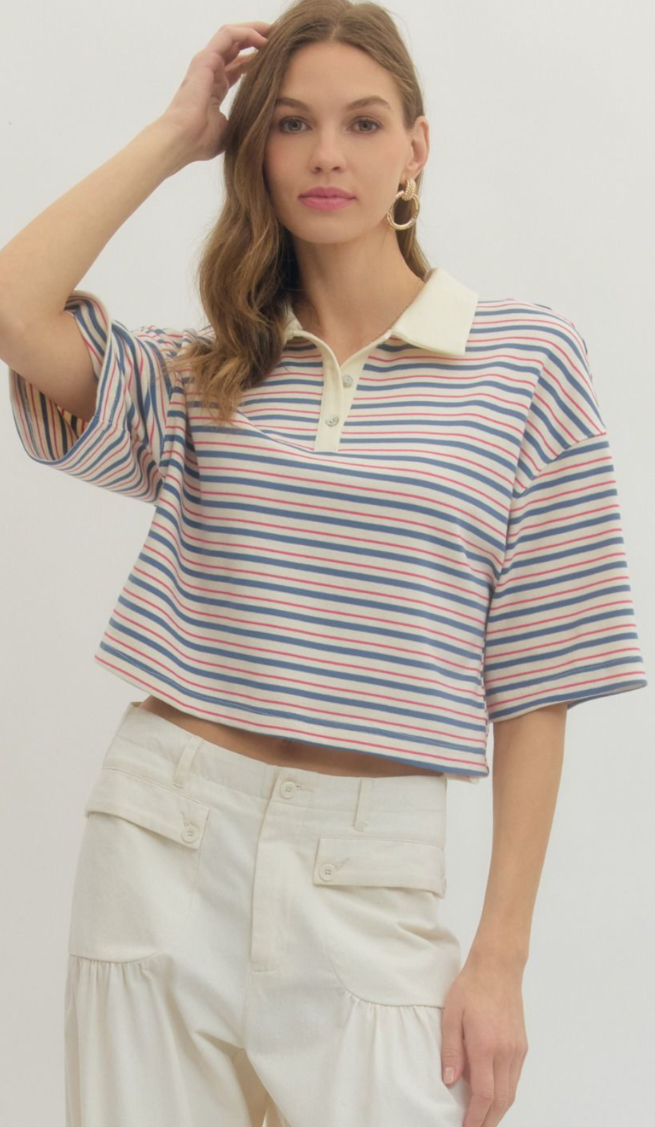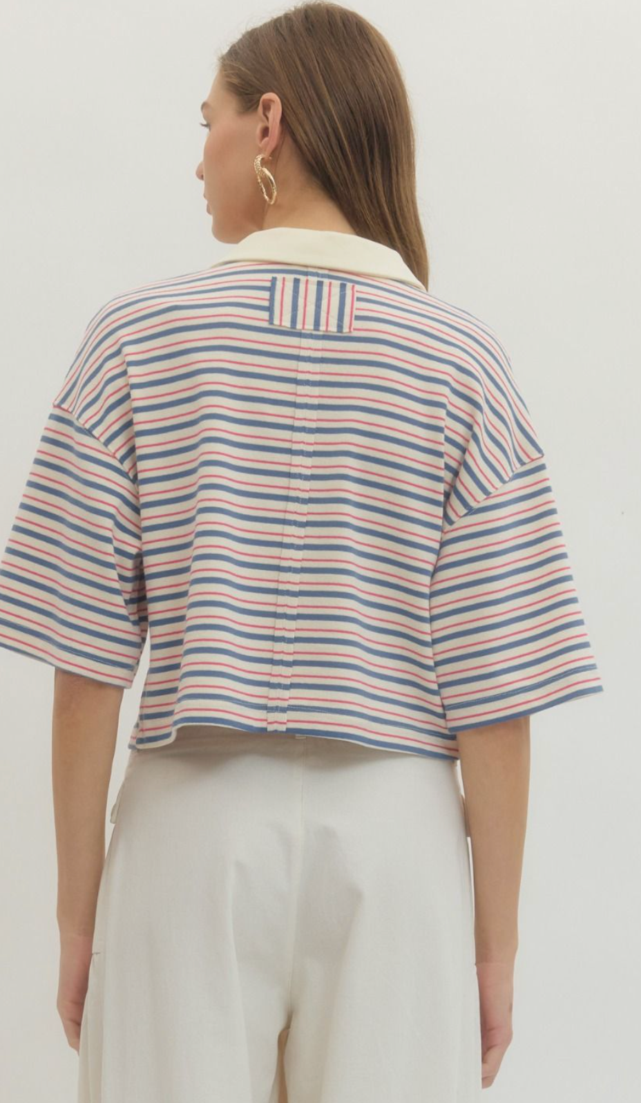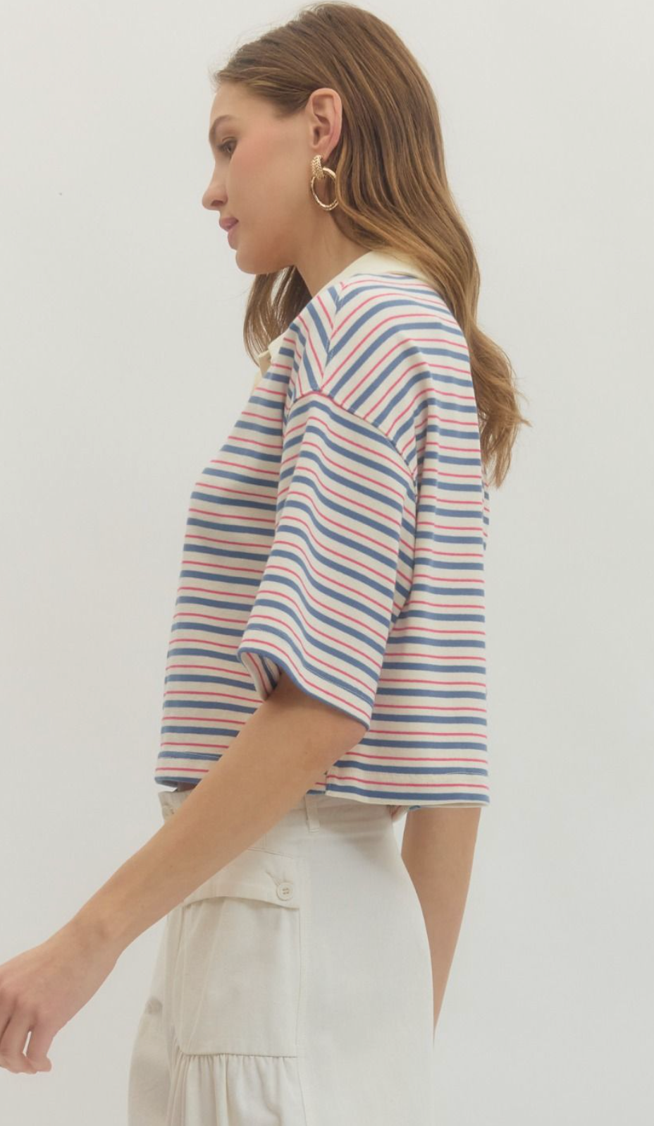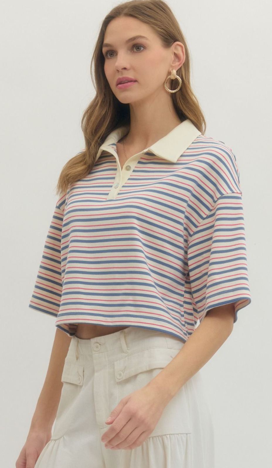 Stripe short sleeve knit top featuring contrast collar and button closure at front. Unlined. Knit. Non-sheer. Lightweight.