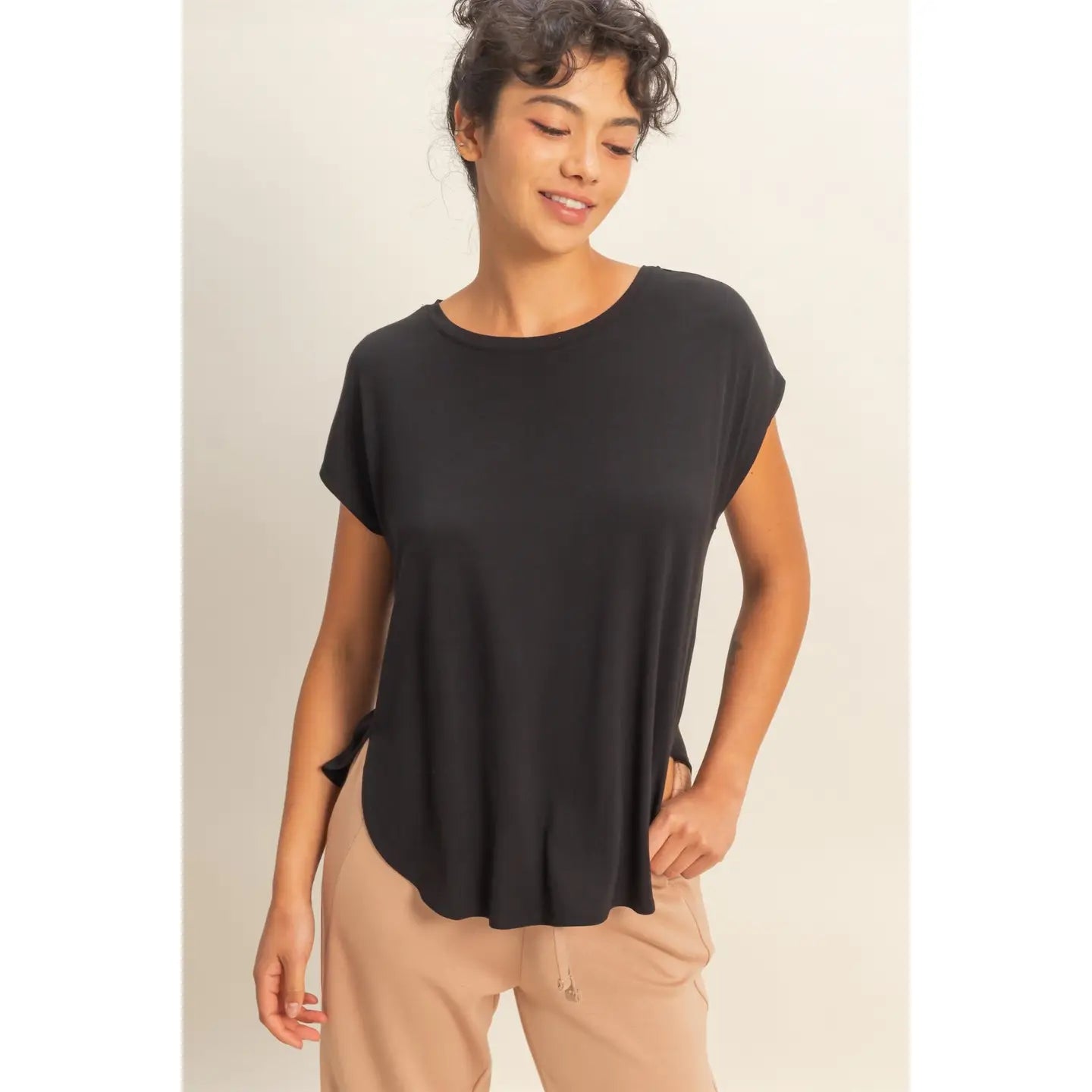 This relaxed, flowy-fit top is crafted from soft rayon-spandex jersey, offering luxurious flow and stretch. The design features a gentle round neckline, dolman cap sleeves, a tunic-style hemline, a center seam in the back, and subtle side slits. Pair this piece with tailored trousers and classic loafers for a chic, daytime look.