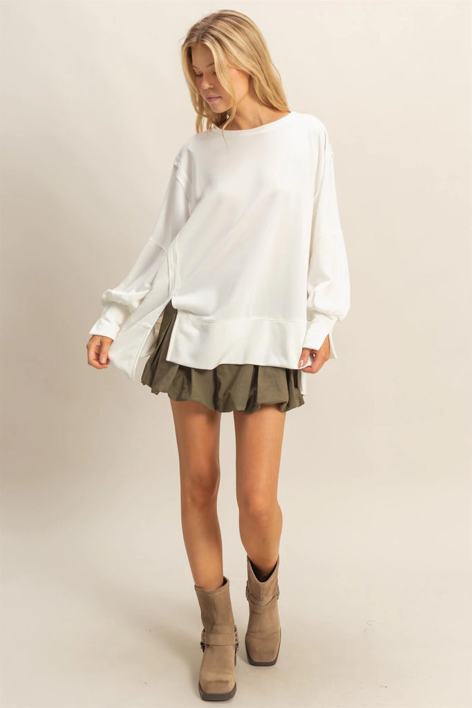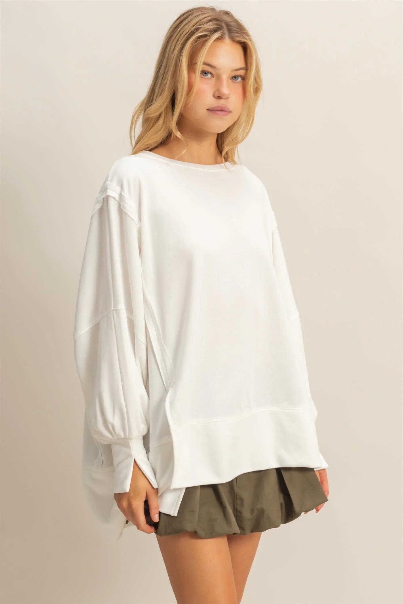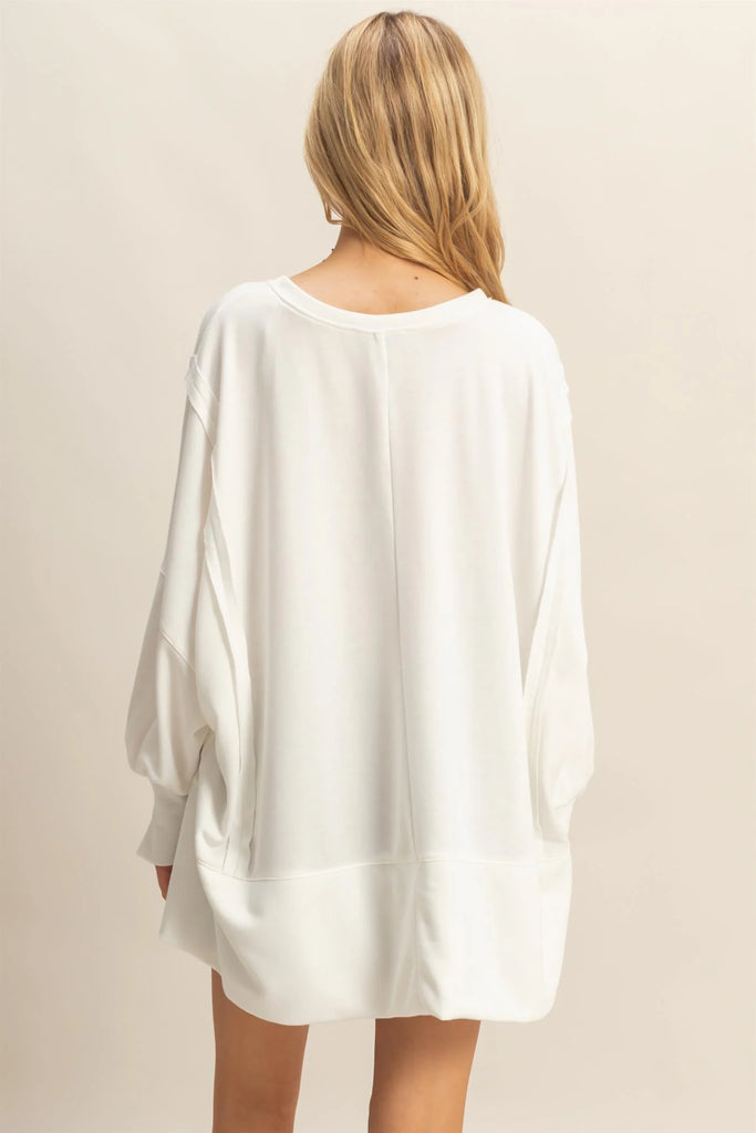 Introducing an effortlessly stylish oversized long-sleeve tee, perfect for those seeking both comfort and style. The distinctively large and draped silhouette ensures a relaxed fit, while the highlighted raglan sleeves with unique extended cuffs add a touch of modern elegance, making it a stand-out choice for casual outings. 100% Polyester Model Is 5' 8" Tall, 32" Chest, 23" Waist, 34" Hips And Wearing A Size Small