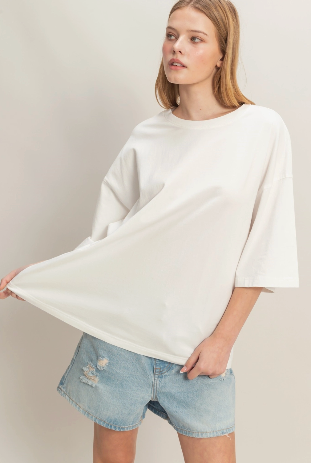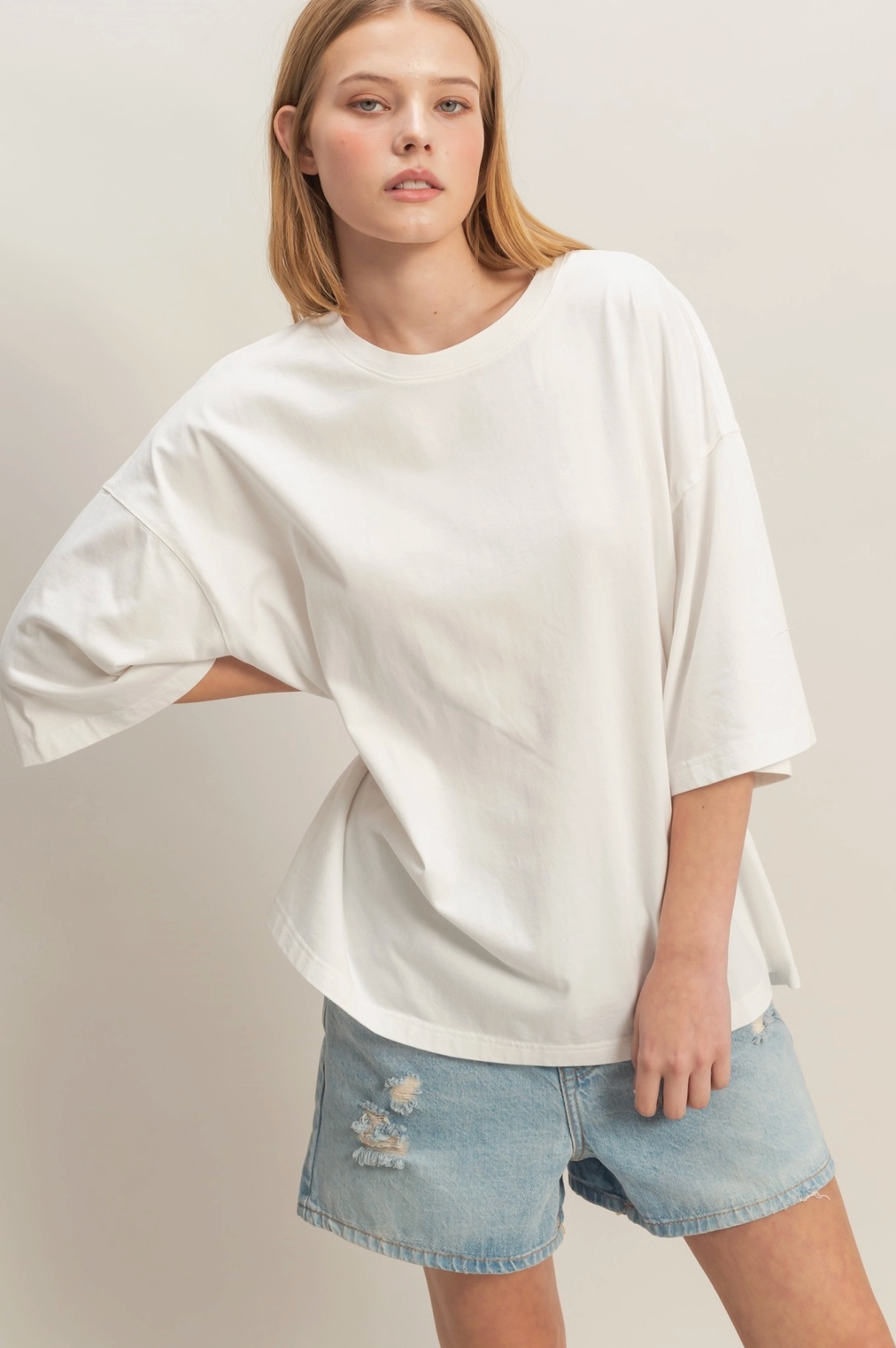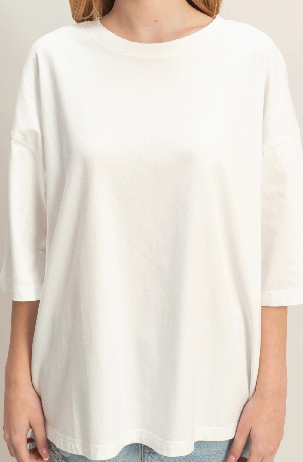 An oversized crew neck top featuring a snow garment wash finish and relaxed fit. Perfectly pairs with slim-fit jeans and ankle boots for a balanced casual style.