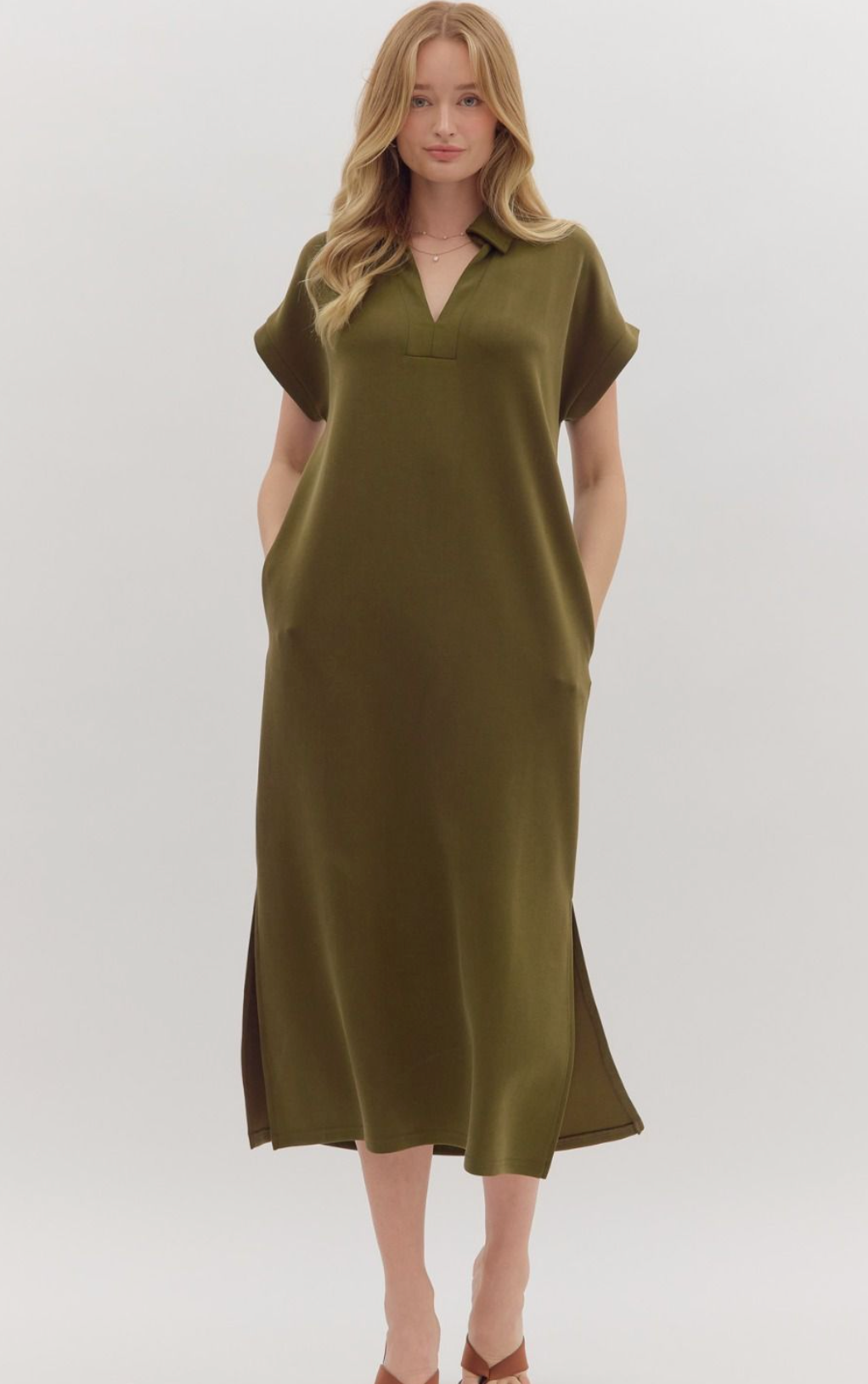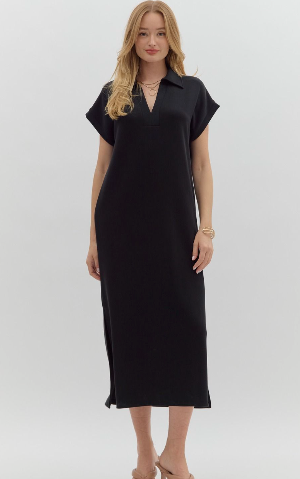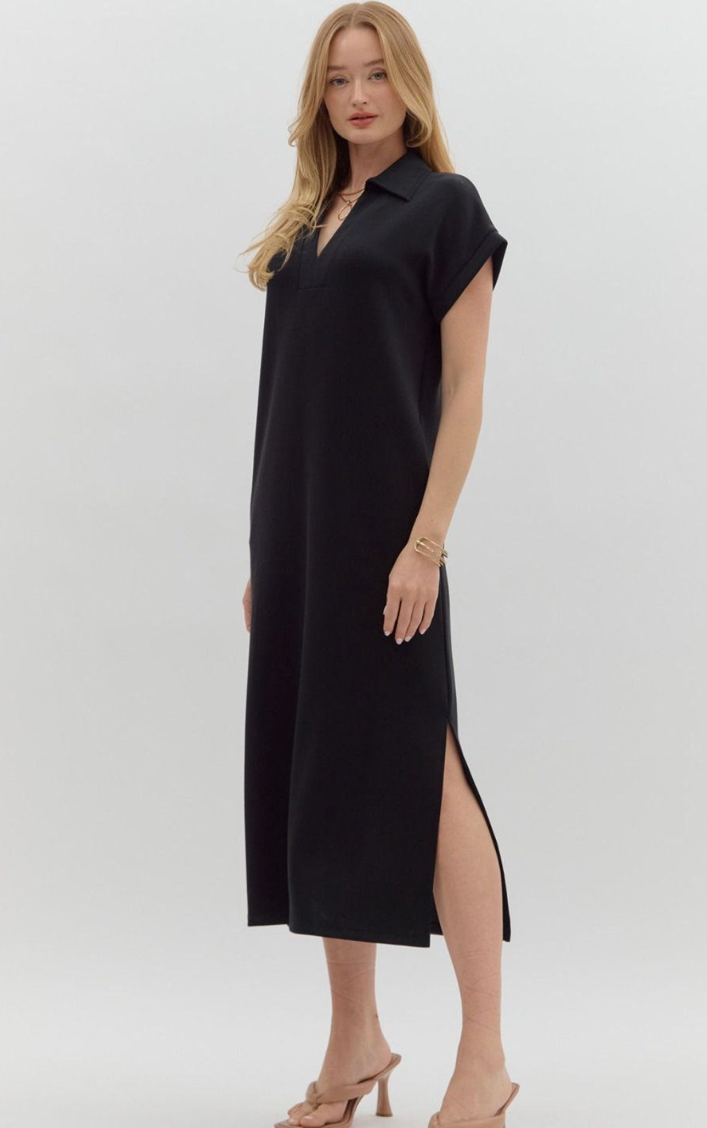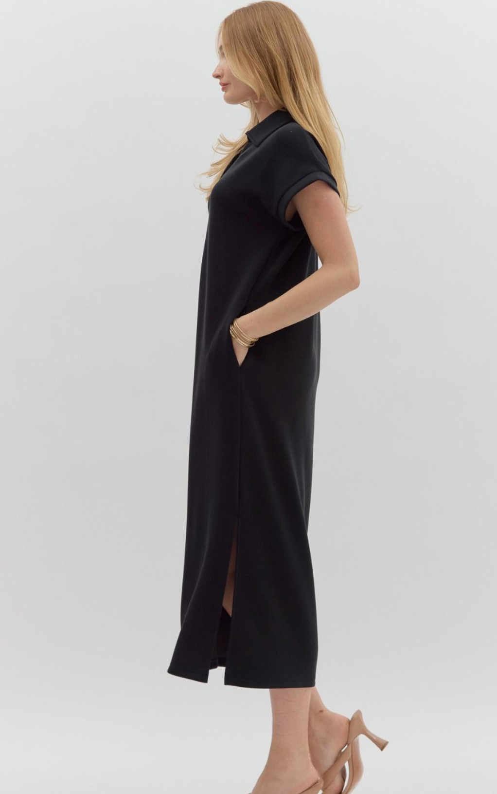 Solid knit split collar short sleeve midi pullover midi dress featuring side slit. Pockets at sides. Unlined. Knit. Non-sheer. Lightweight.