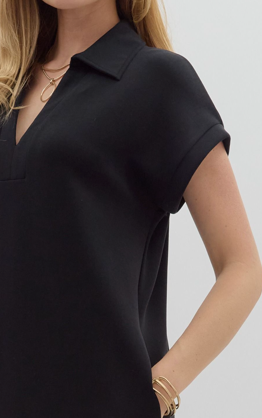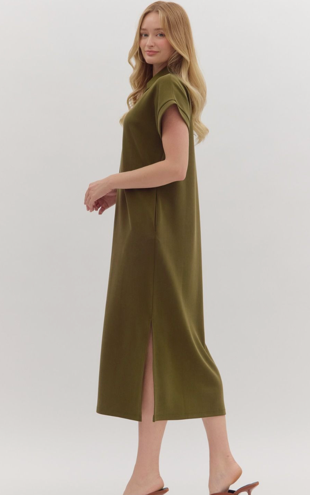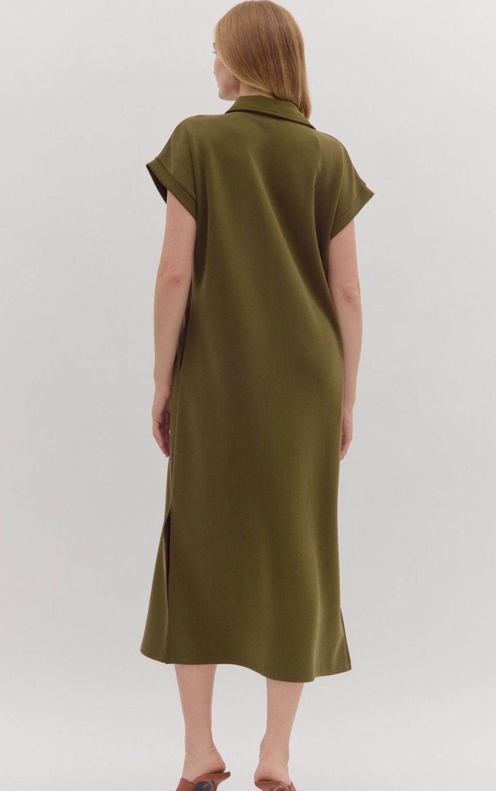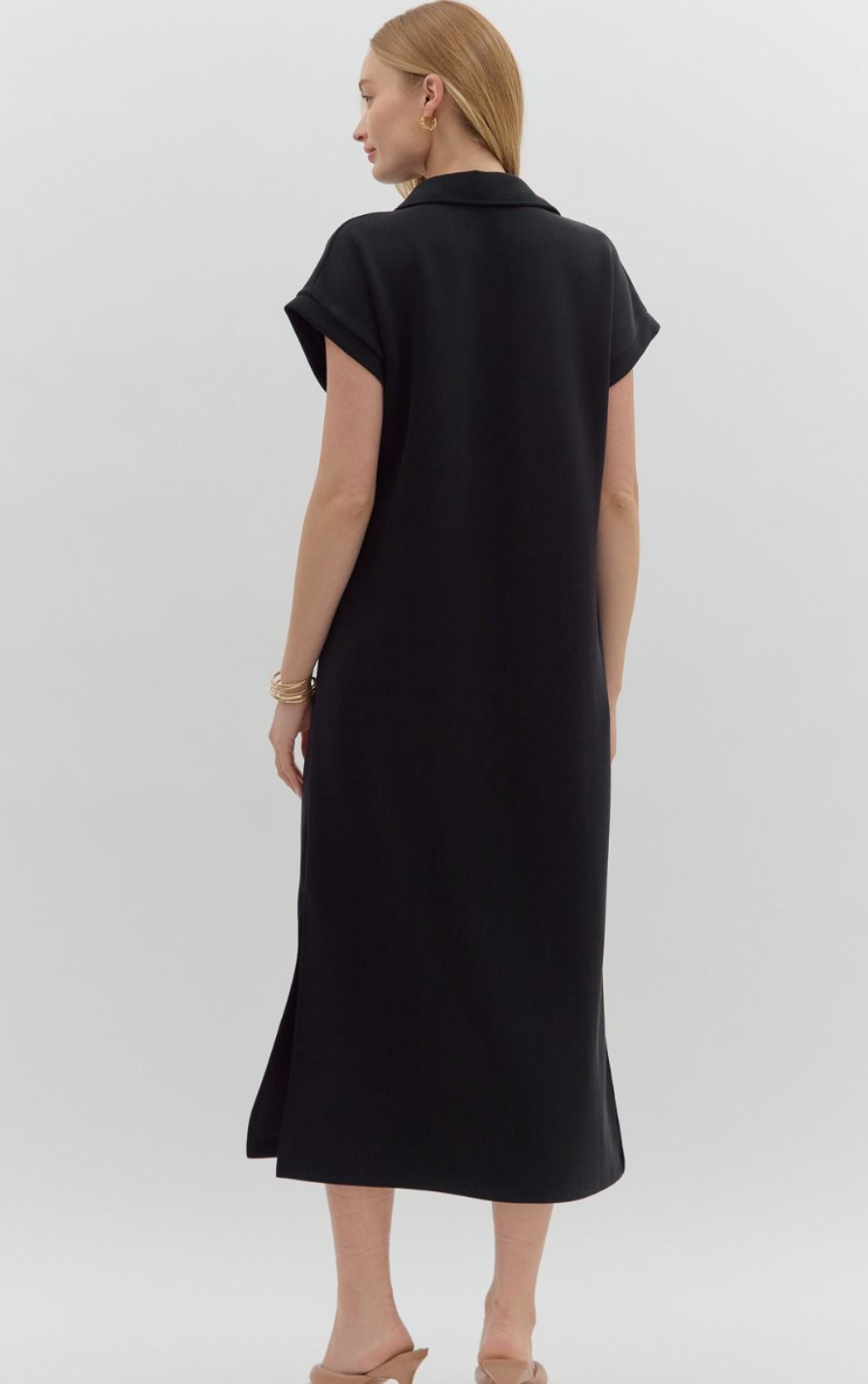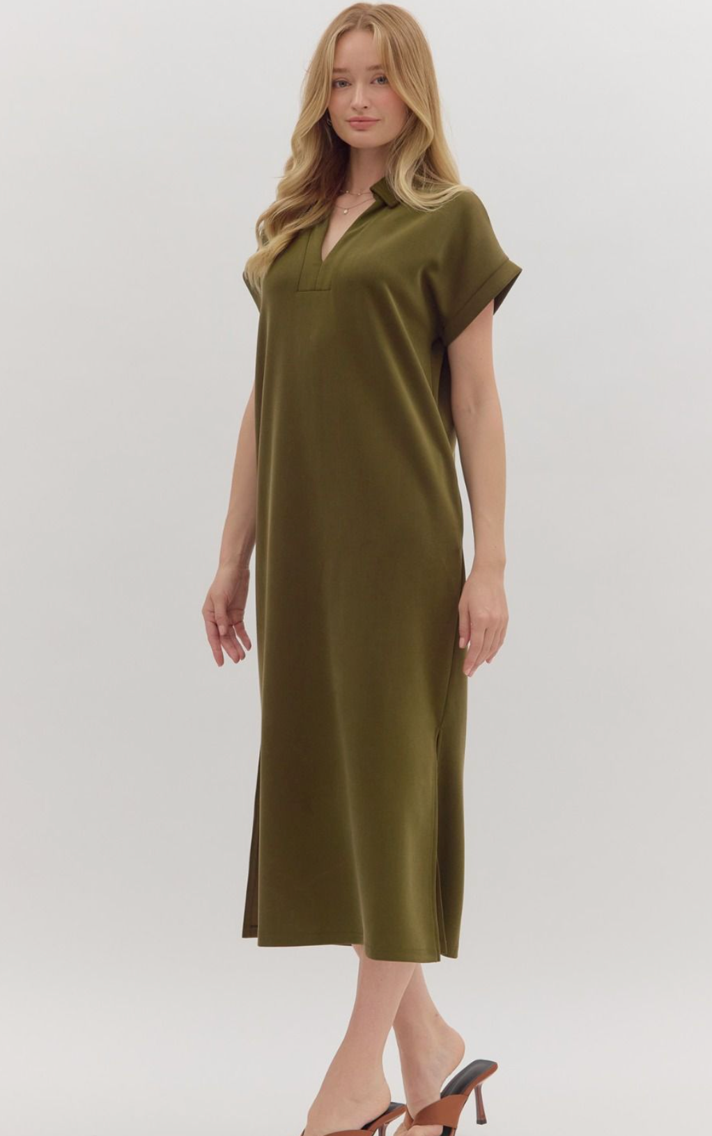 Solid knit split collar short sleeve midi pullover midi dress featuring side slit. Pockets at sides. Unlined. Knit. Non-sheer. Lightweight.
