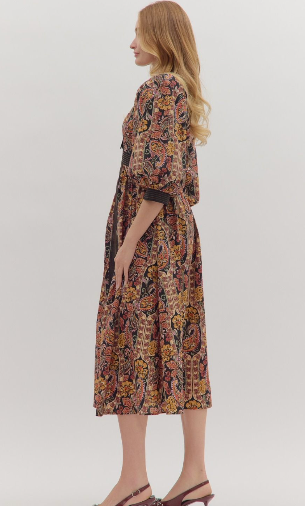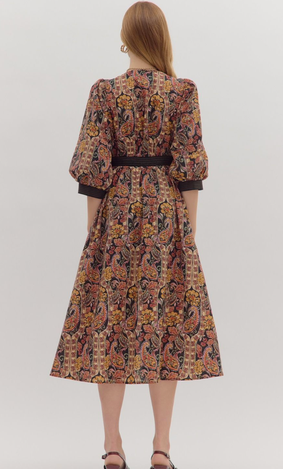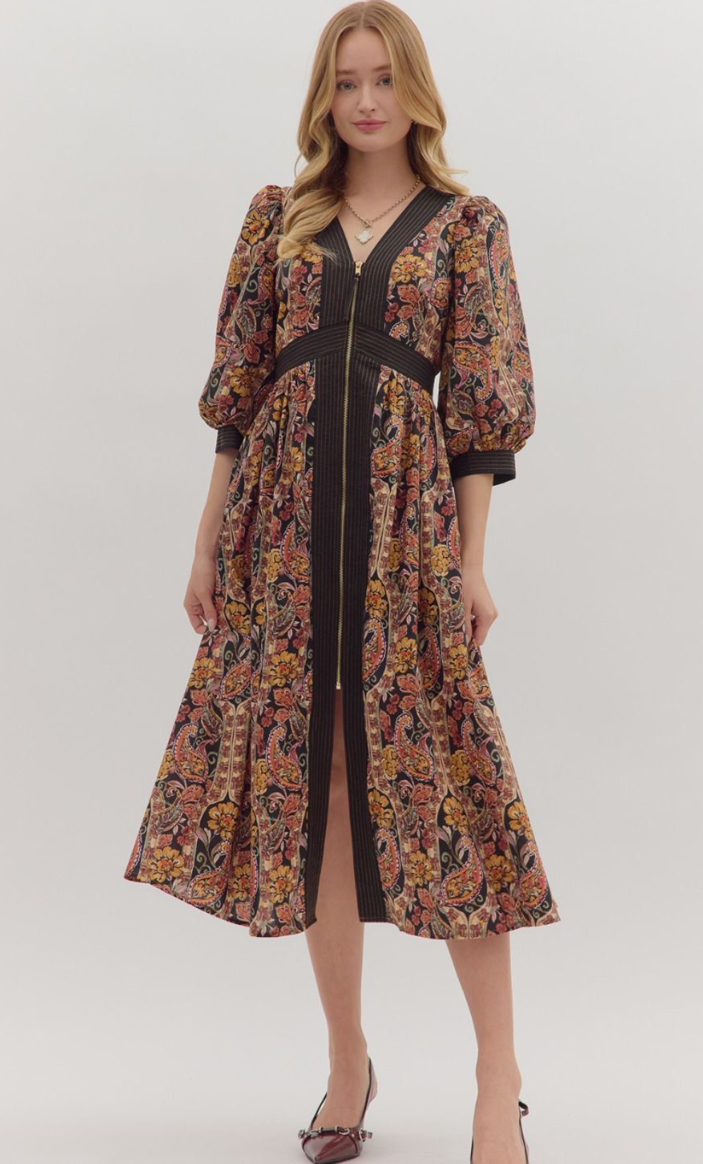 Paisley print puff sleeve midi dress featuring striped trim and partial front zipper closure. Side pockets. Lined. Woven. Non-sheer. Lightweight.