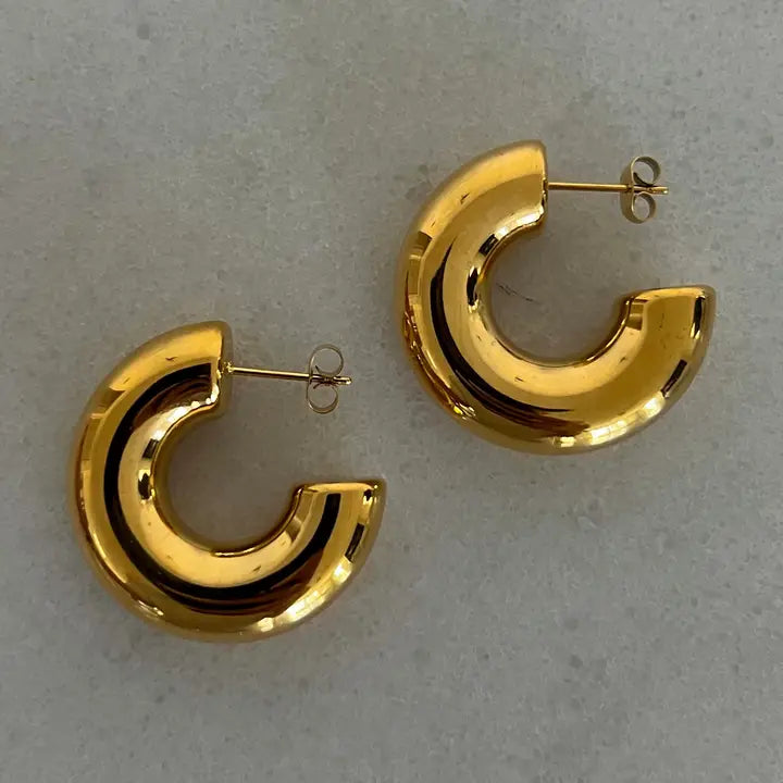 Discover the elegance of our Gold Smooth Hoops. These timeless pieces are water-resistant, ensuring they maintain their shine and quality in any weather. Whether for a casual outing or a special event, these earrings add a sophisticated touch to any outfit.