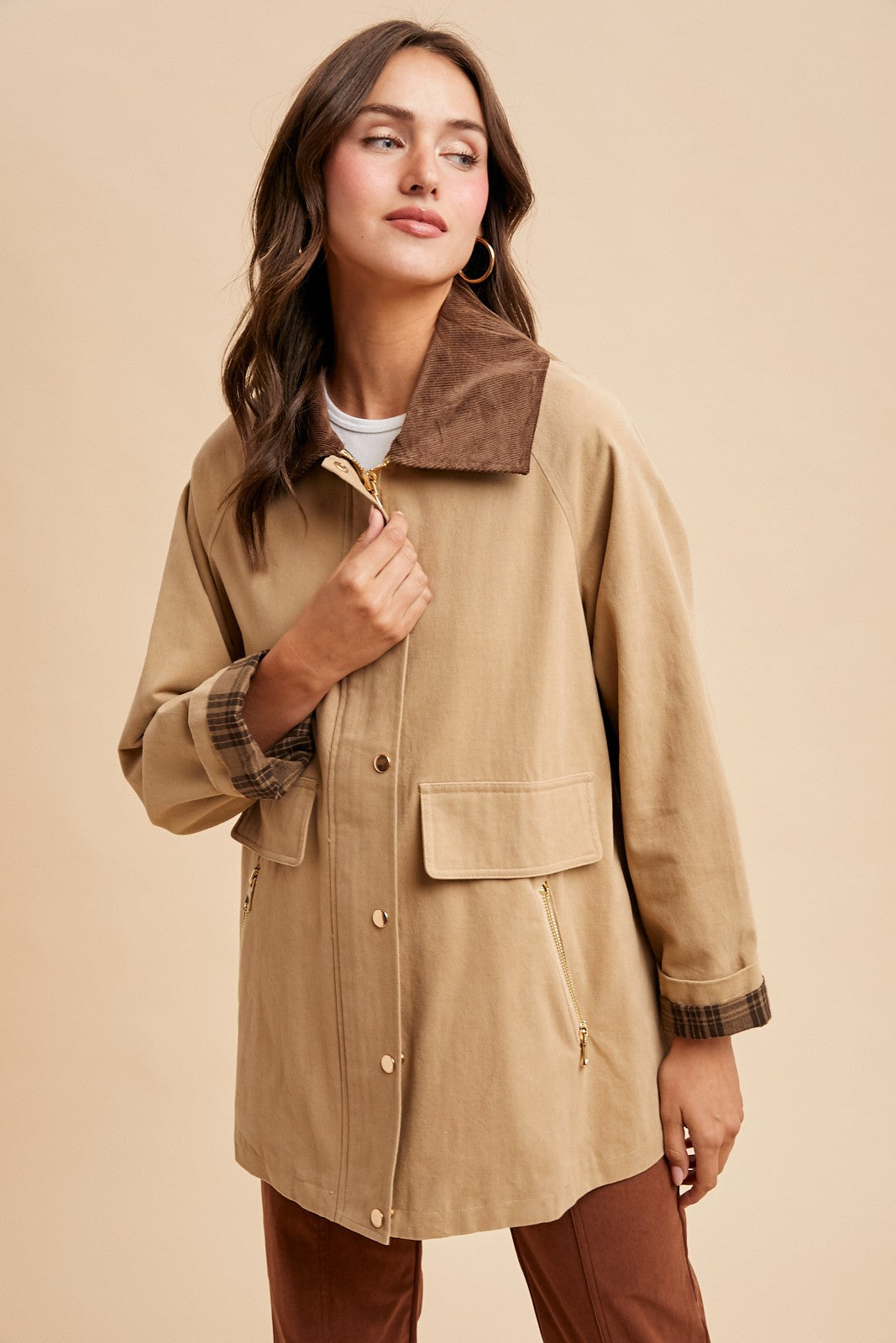 CHORE JACKET FEATURES: - COTTON GARMENT WASHED FABRICATION - FAUX POCKET FLAPS - ZIPPERED SIDE POCKETS - CORDUROY SPREAD COLLAR - METAL SNAP BUTTONS - TARTAN LINING ON INSIDE AND SLEEVES - SPLIT VENT FLAPS WITH SNAP BUTTON CLOSURE AT BACK