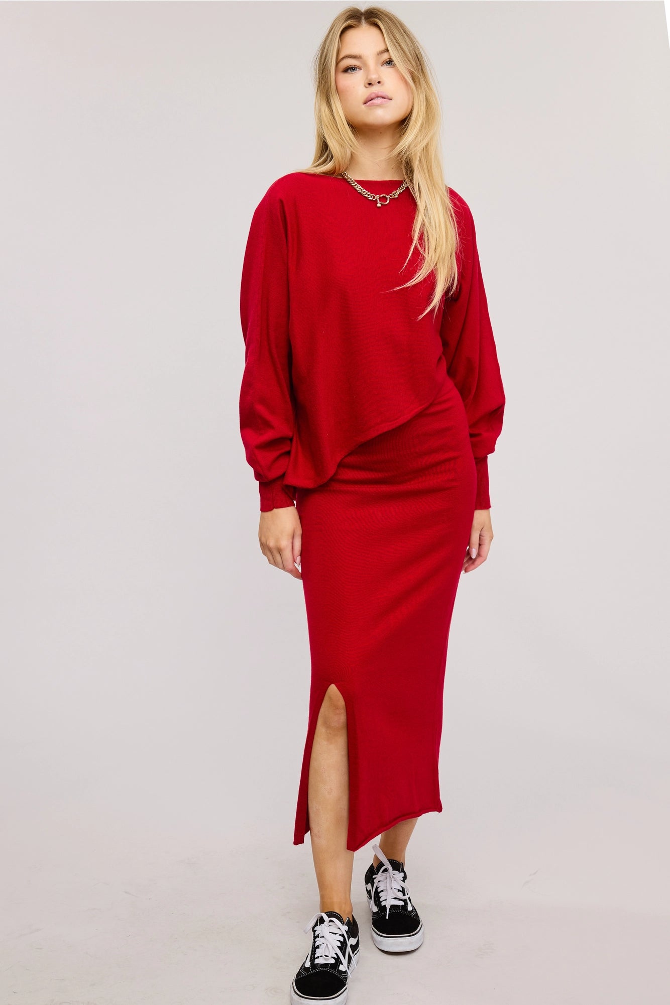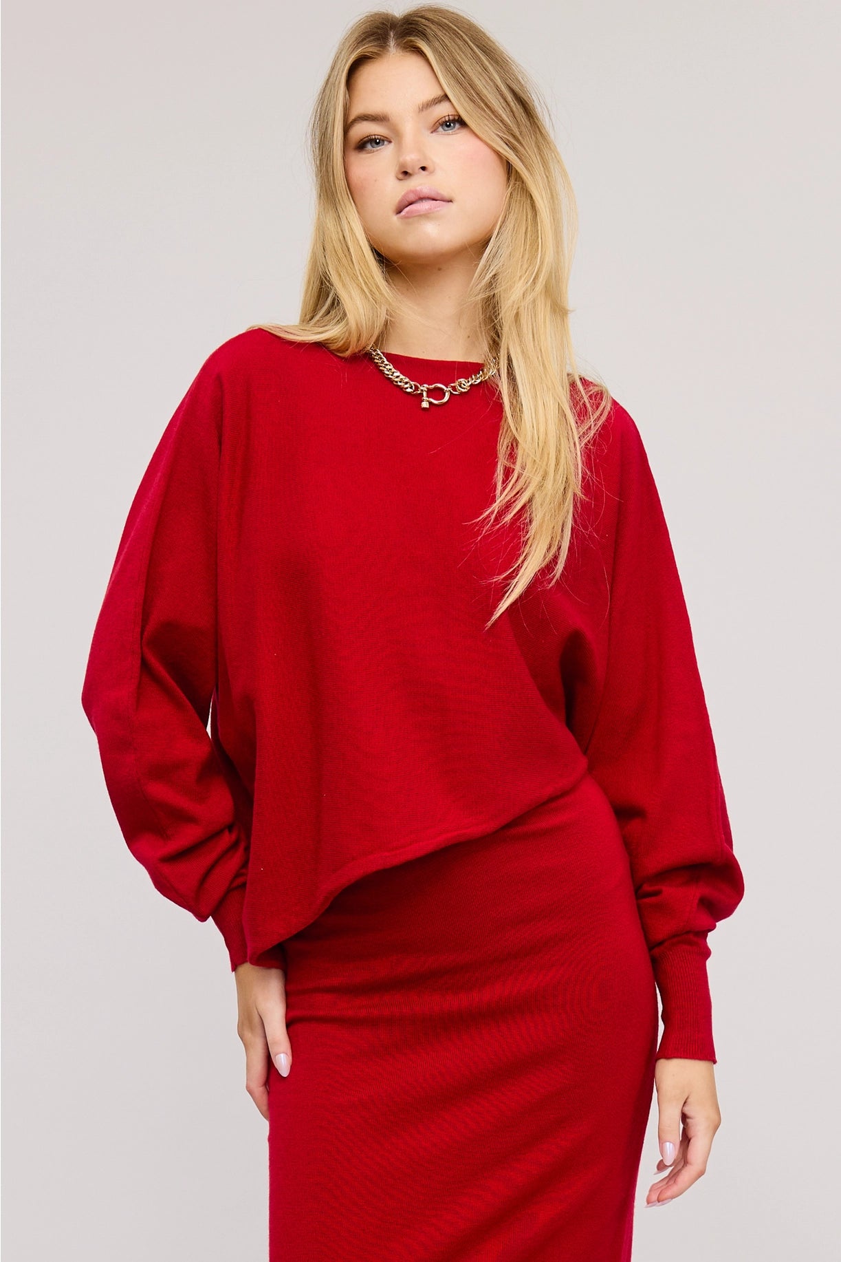 Made from a soft, and lighter solid knit material. Top features long sleeves, snug cuffs, broad neckline, and an asymmetrical silhouette.
