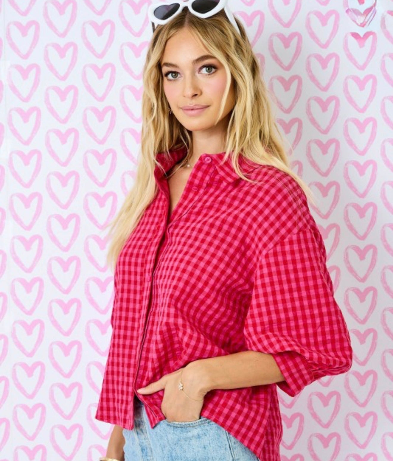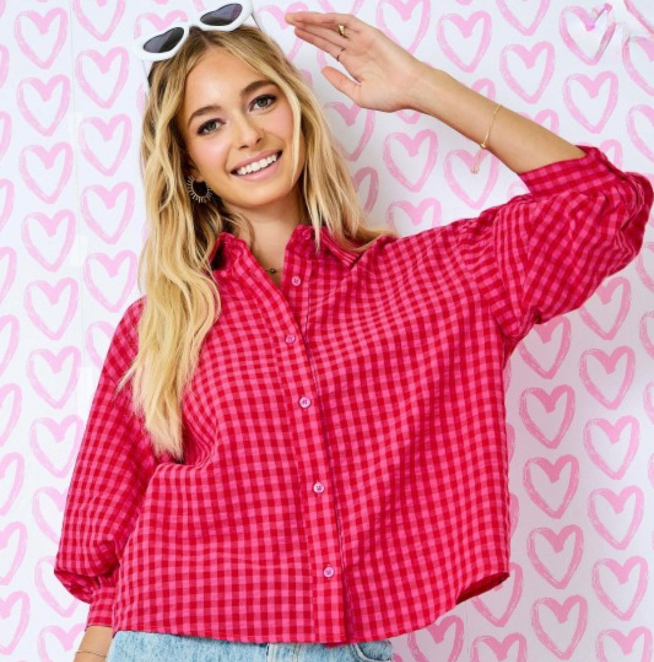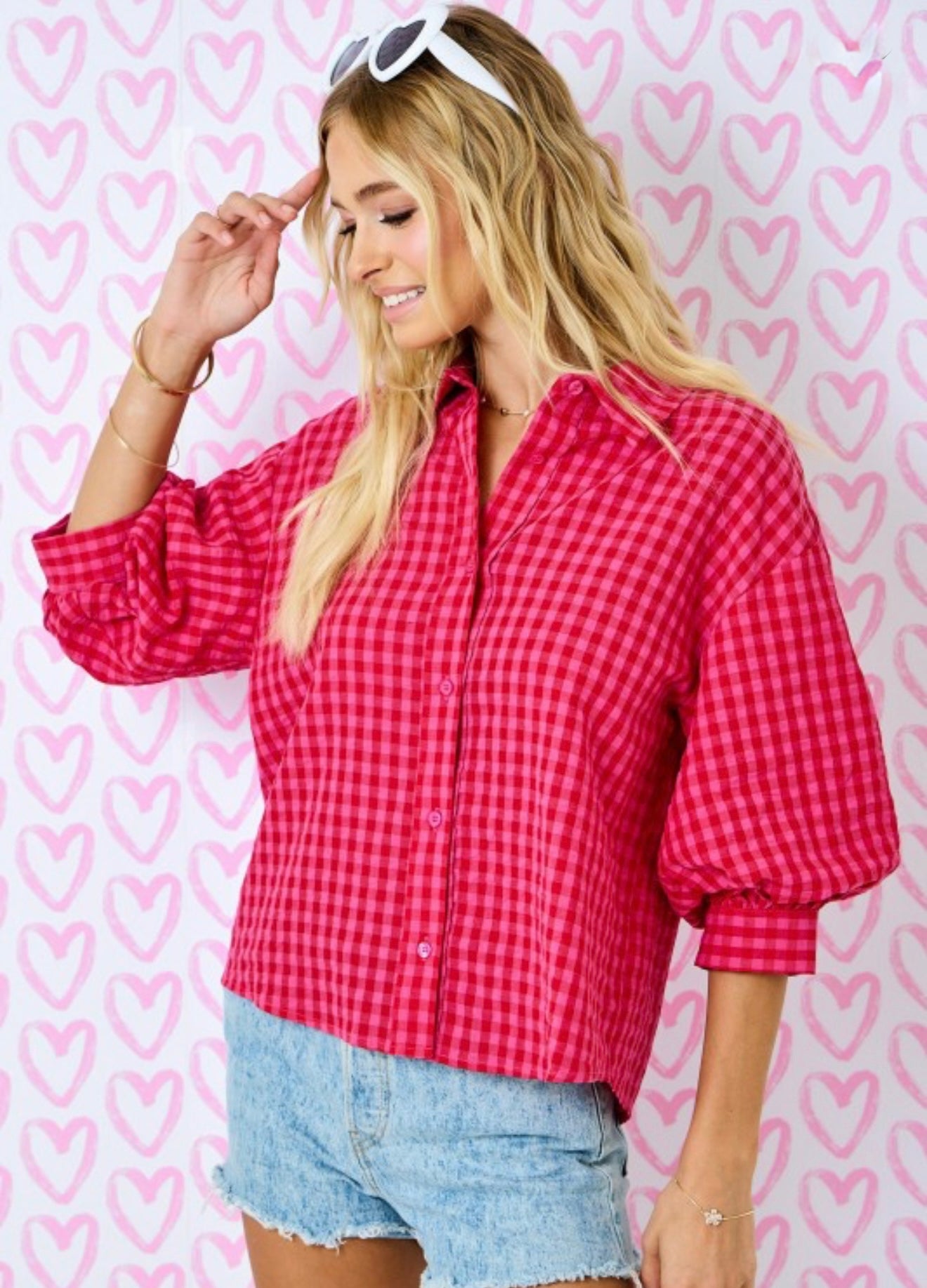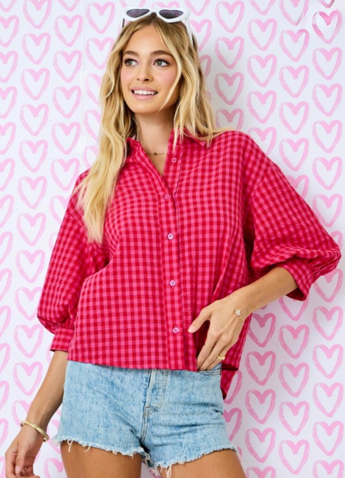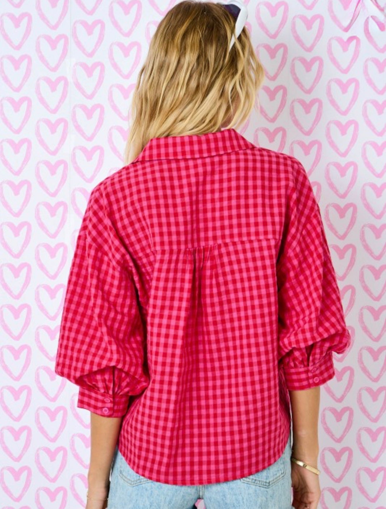 Gingham Button Down Shirt W/ 3/4 Bubble Sleeve