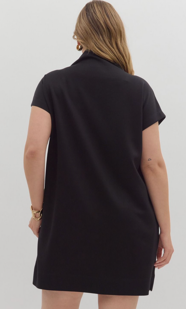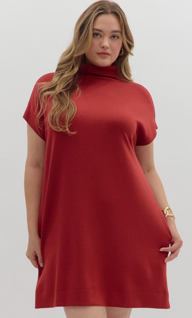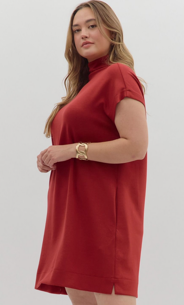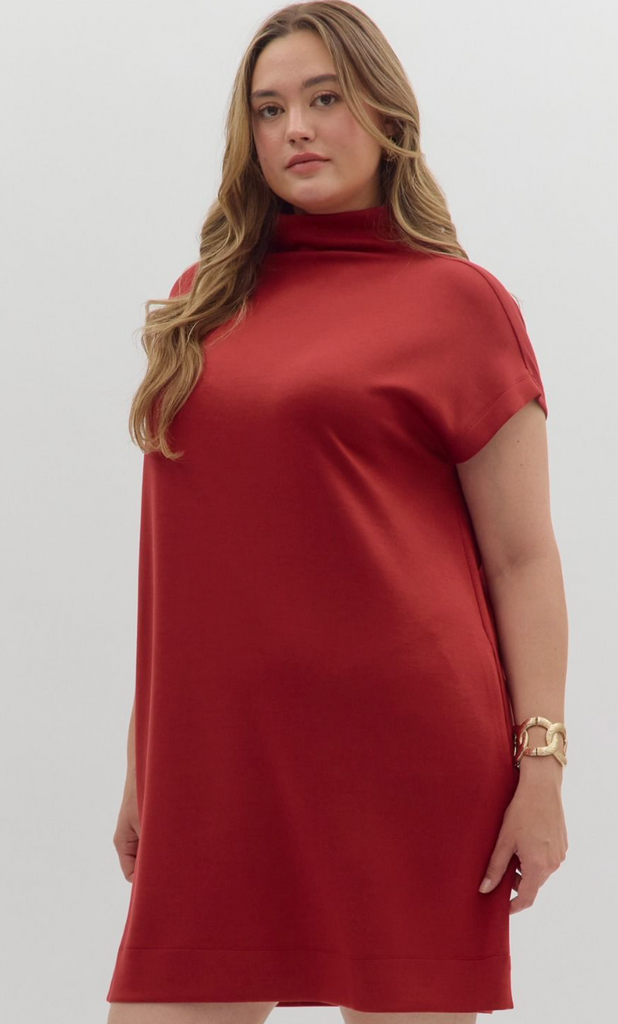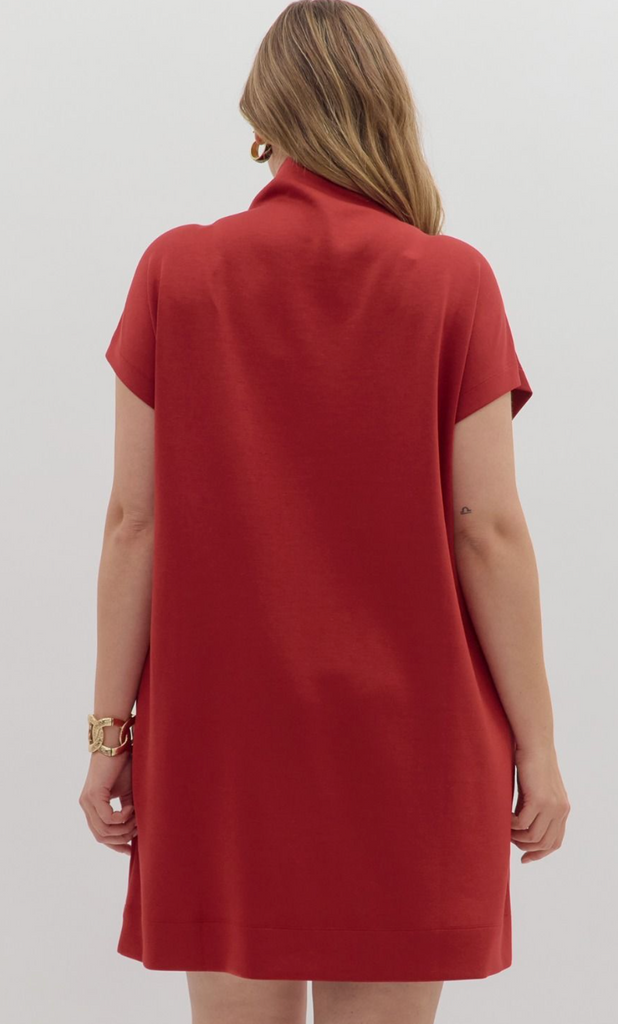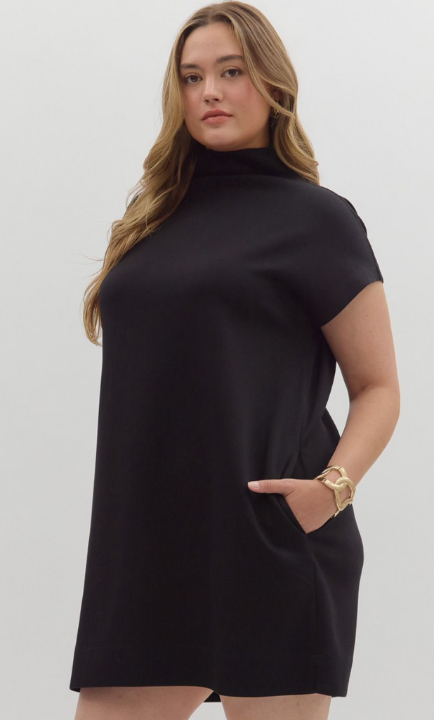 Solid jersey mock neck pullover mini dress. Side pockets. Unlined. Knit. Non-sheer. Lightweight