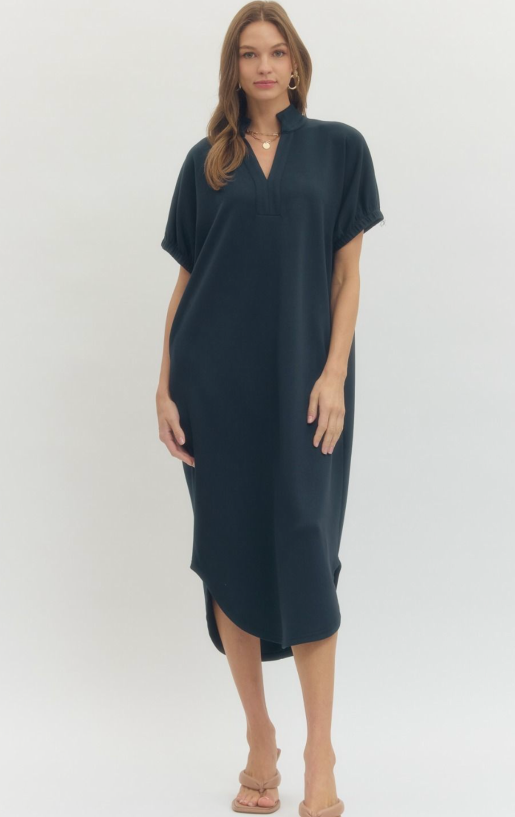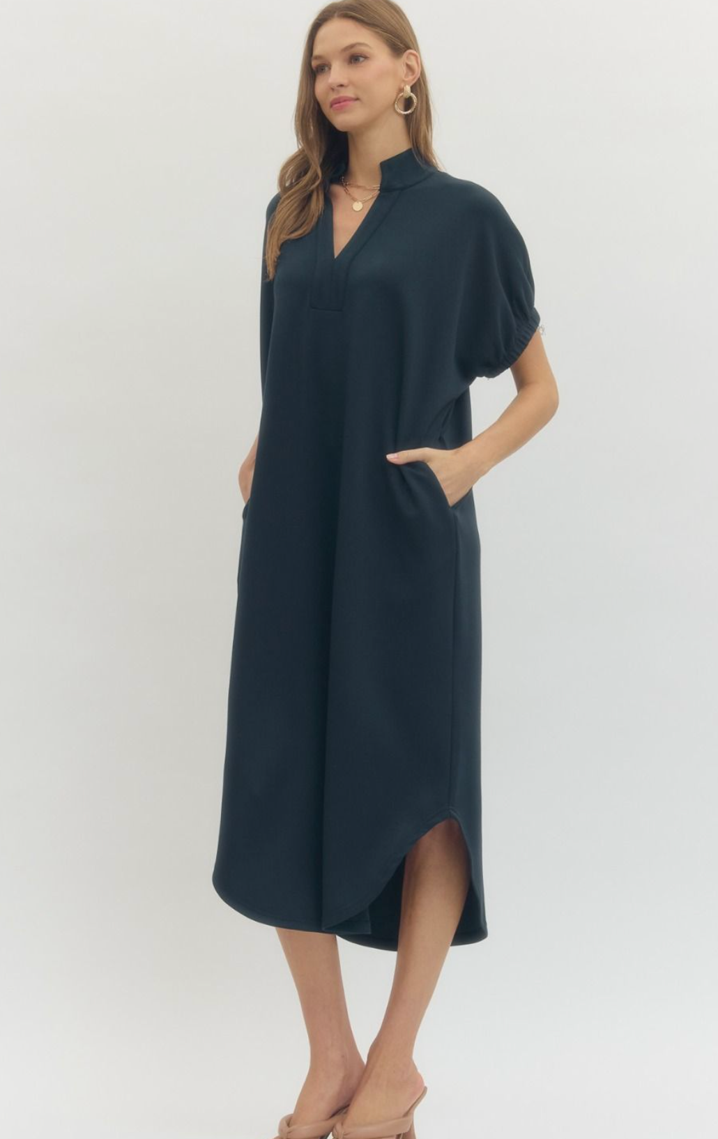 Solid short sleeve midi dress featuring band collar V-neck and elasticated sleeve openings. Side pockets. Unlined. Knit. Non-sheer. Lightweight.