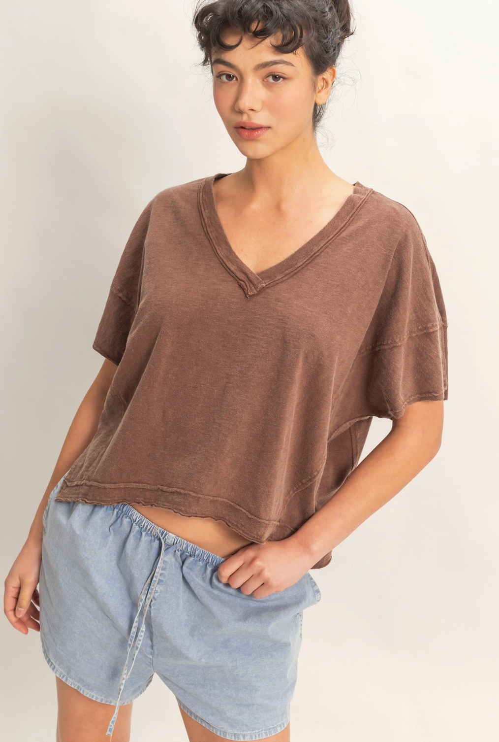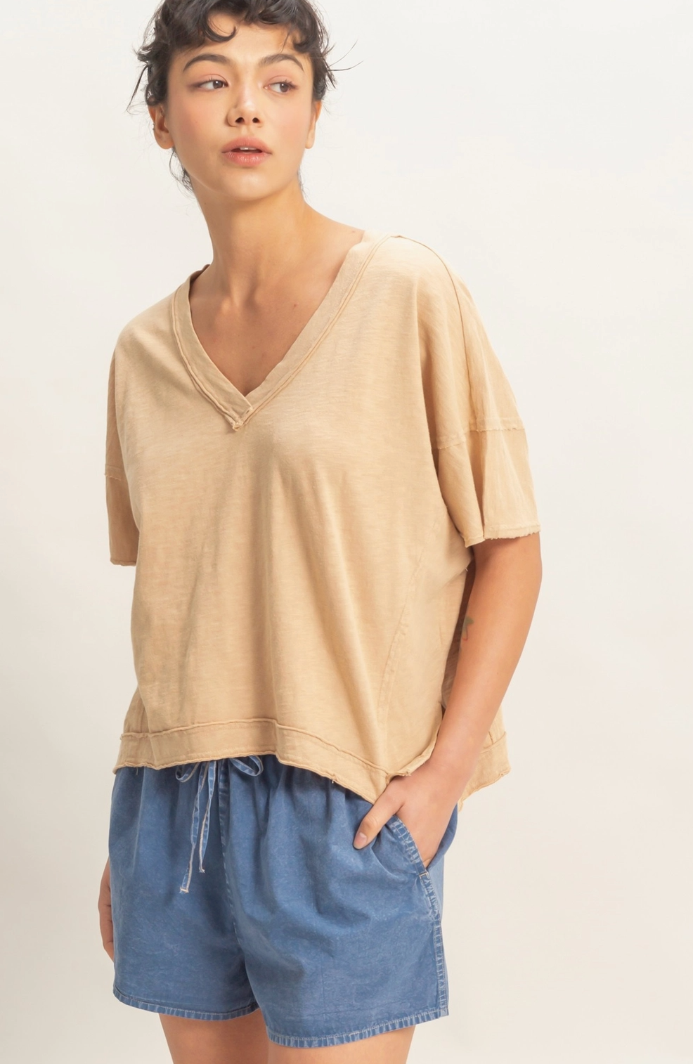 Crafted from fabric dyed and acid washed cotton, this comfortable V-neck top showcases a side slit and short sleeves to create a graceful, relaxed silhouette. Exposed raw edge seams and a subtle cropped length add an artisanal touch. This oversized top is perfectly paired with high-waisted jeans for a laid-back style. 100% Cotton Model Is 5' 7" Tall, 32" Chest, 25" Waist, 36" Hips And Wearing A Size Small