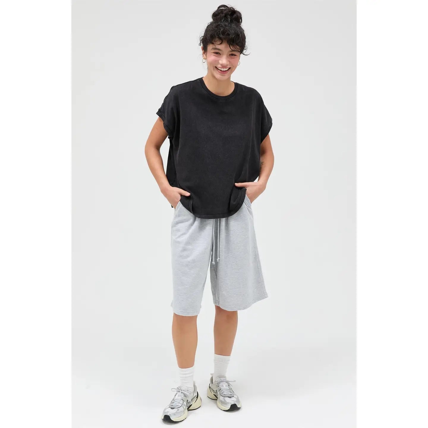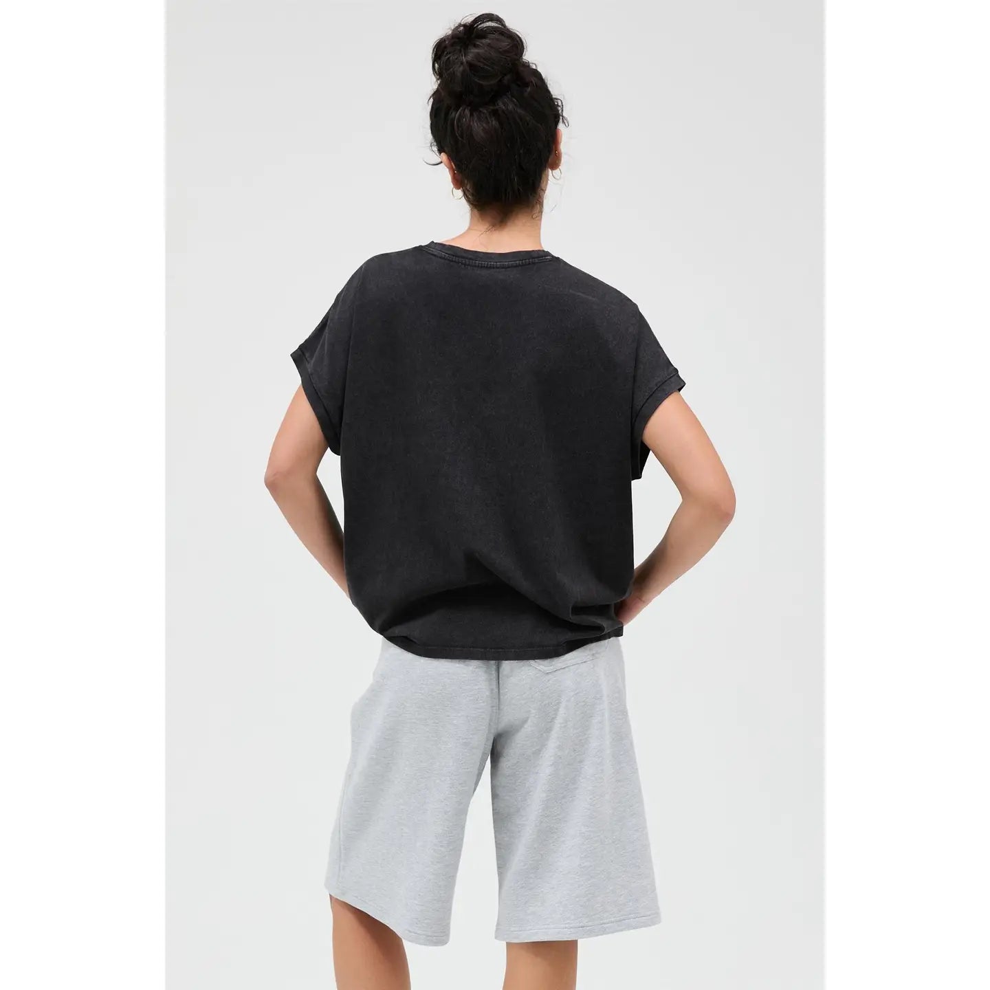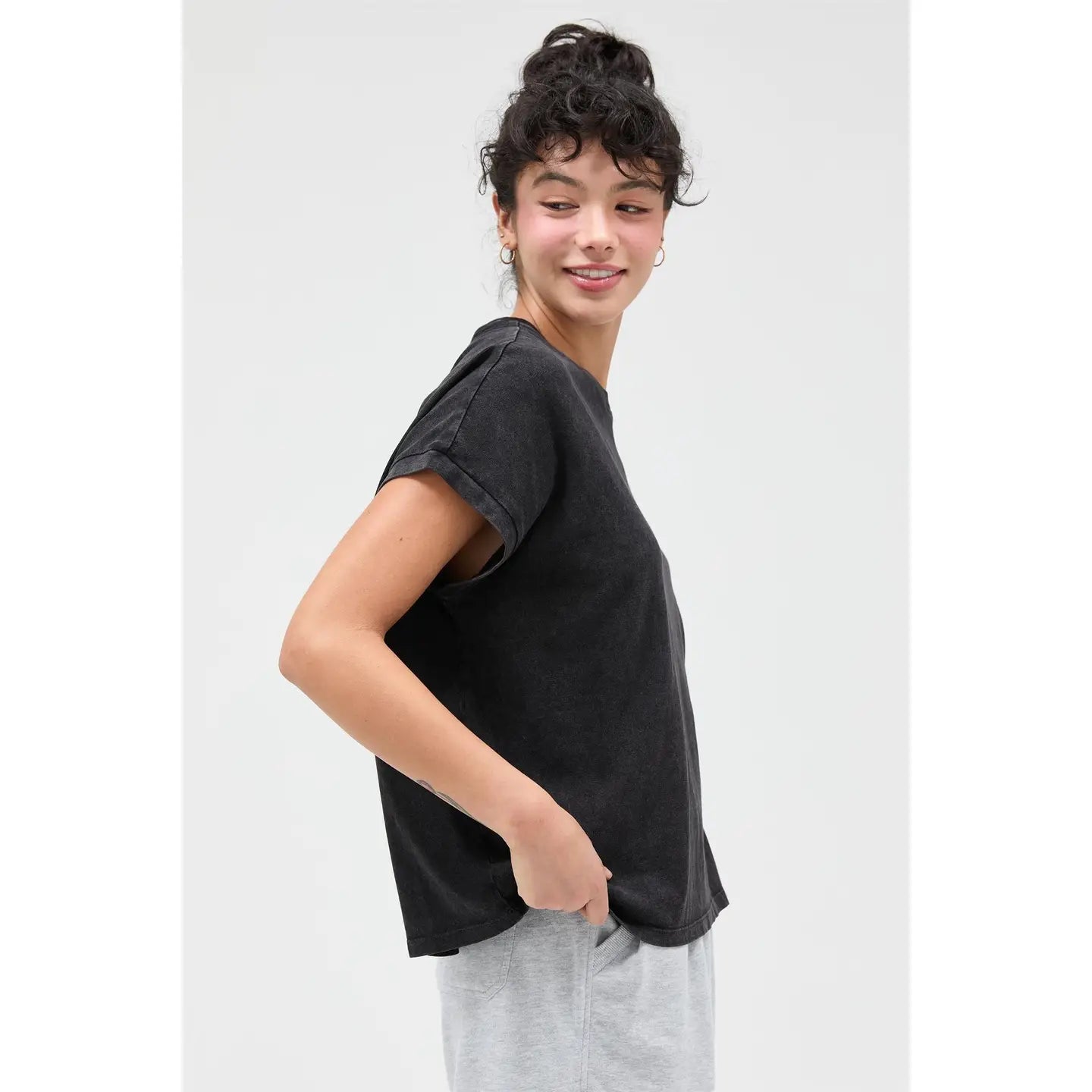This essential tee features a classic crew neckline with distinctly shaped capped sleeves. The garment is cut in a comfortable, relaxed, slightly boxy fit. A unique mineral wash finish gives the fabric an authentic worn-in texture and faded vintage look. Pair with denim shorts and sneakers for a casual, effortless outfit.