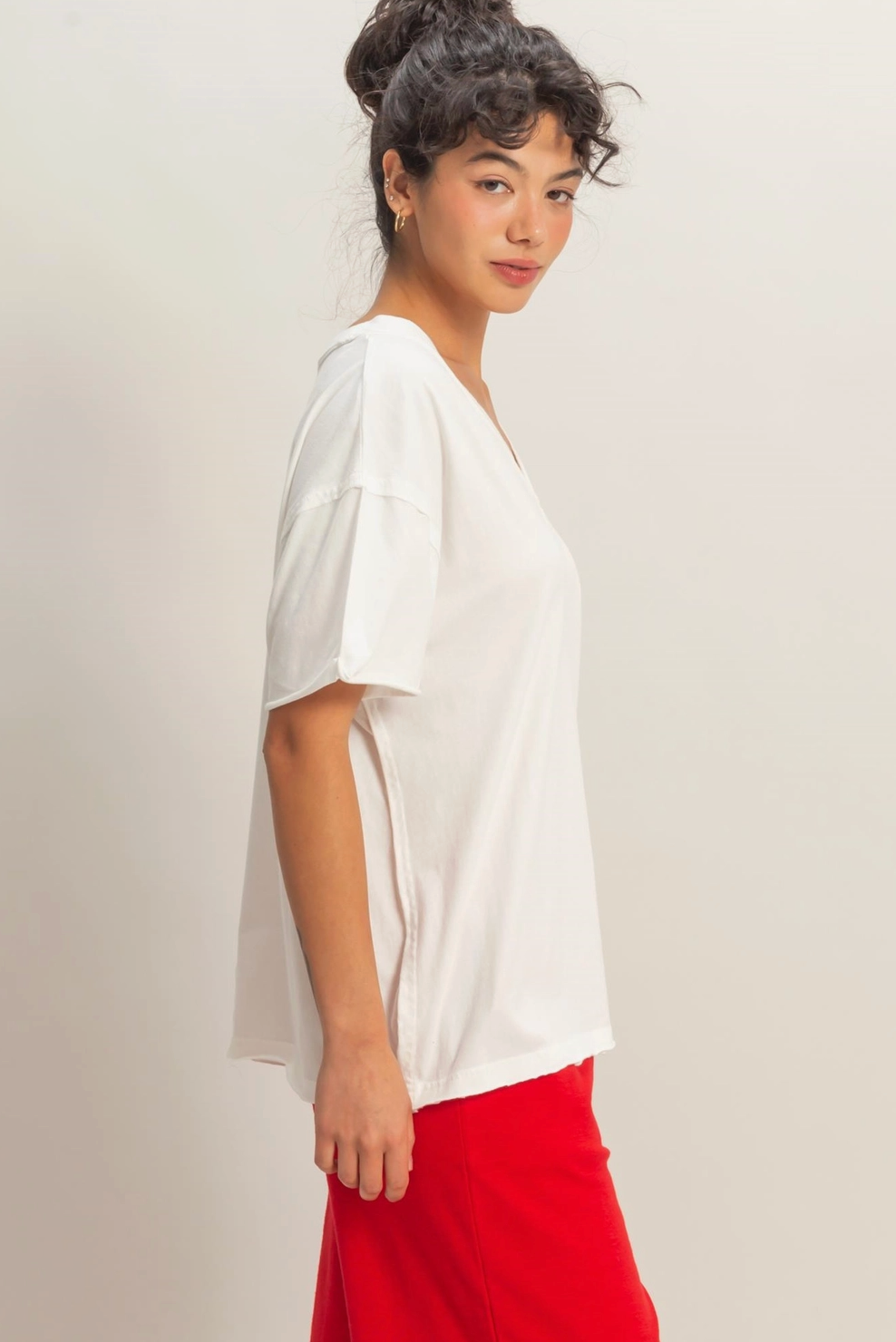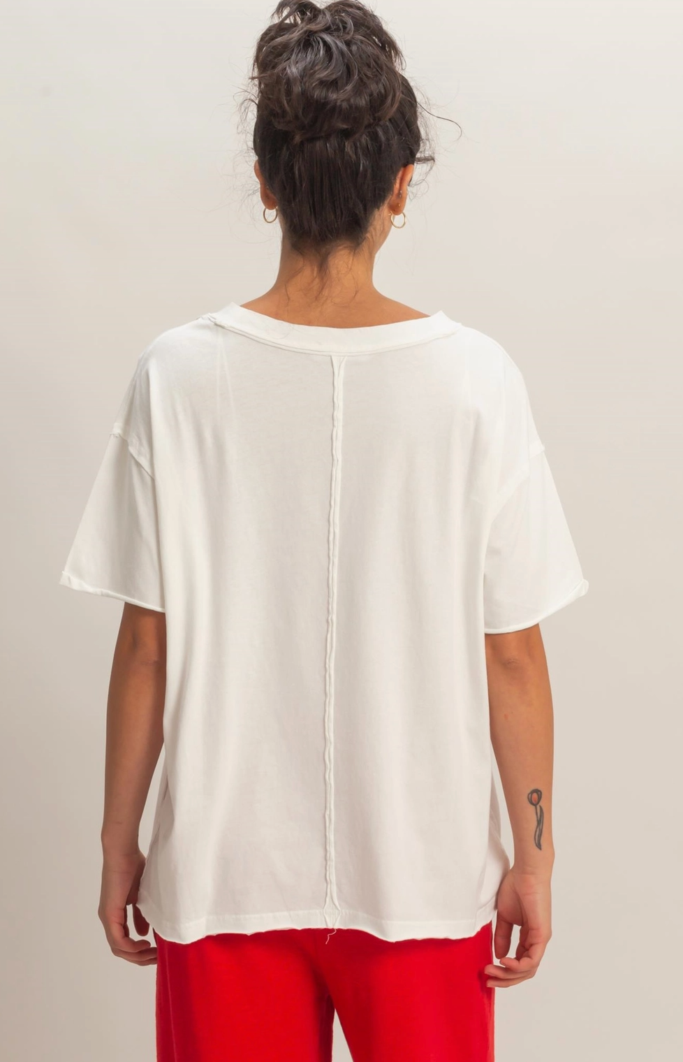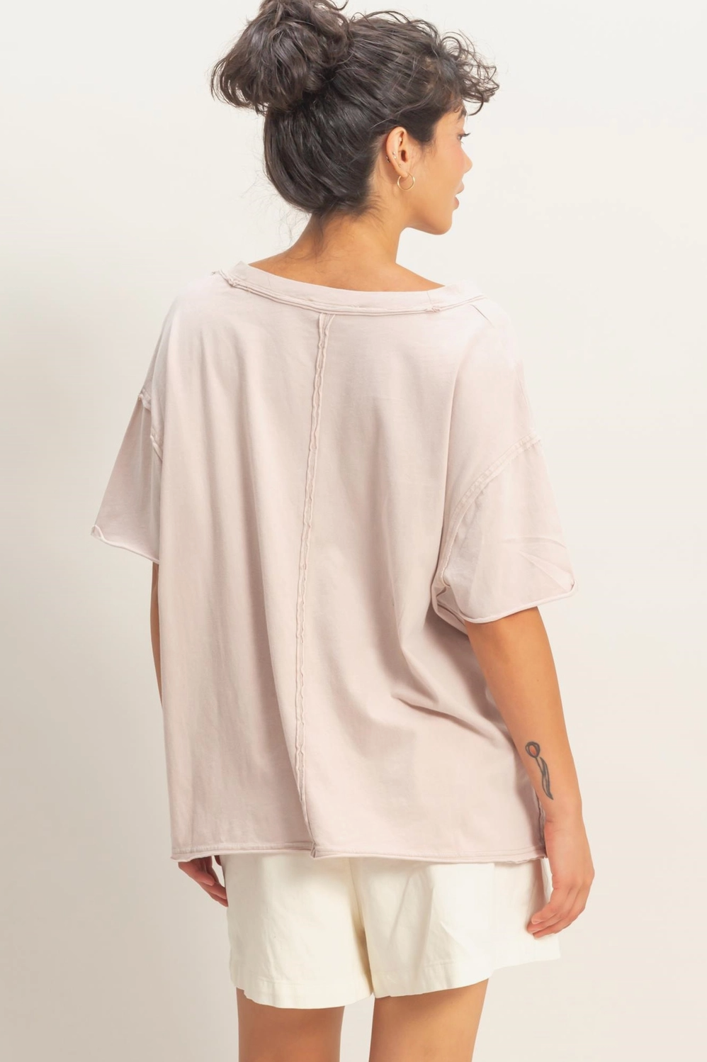 This T-shirt is crafted from soft cotton with a vintage wash finish. The design features a deep, raw-edge V-neckline. a center back seam, exposed seams, and comfortable, wide sleeves. The cut is an oversized, boxy fit finished with a raw edge hemline.Pair with jeans and sneakers for an effortlessly chic and casual style.