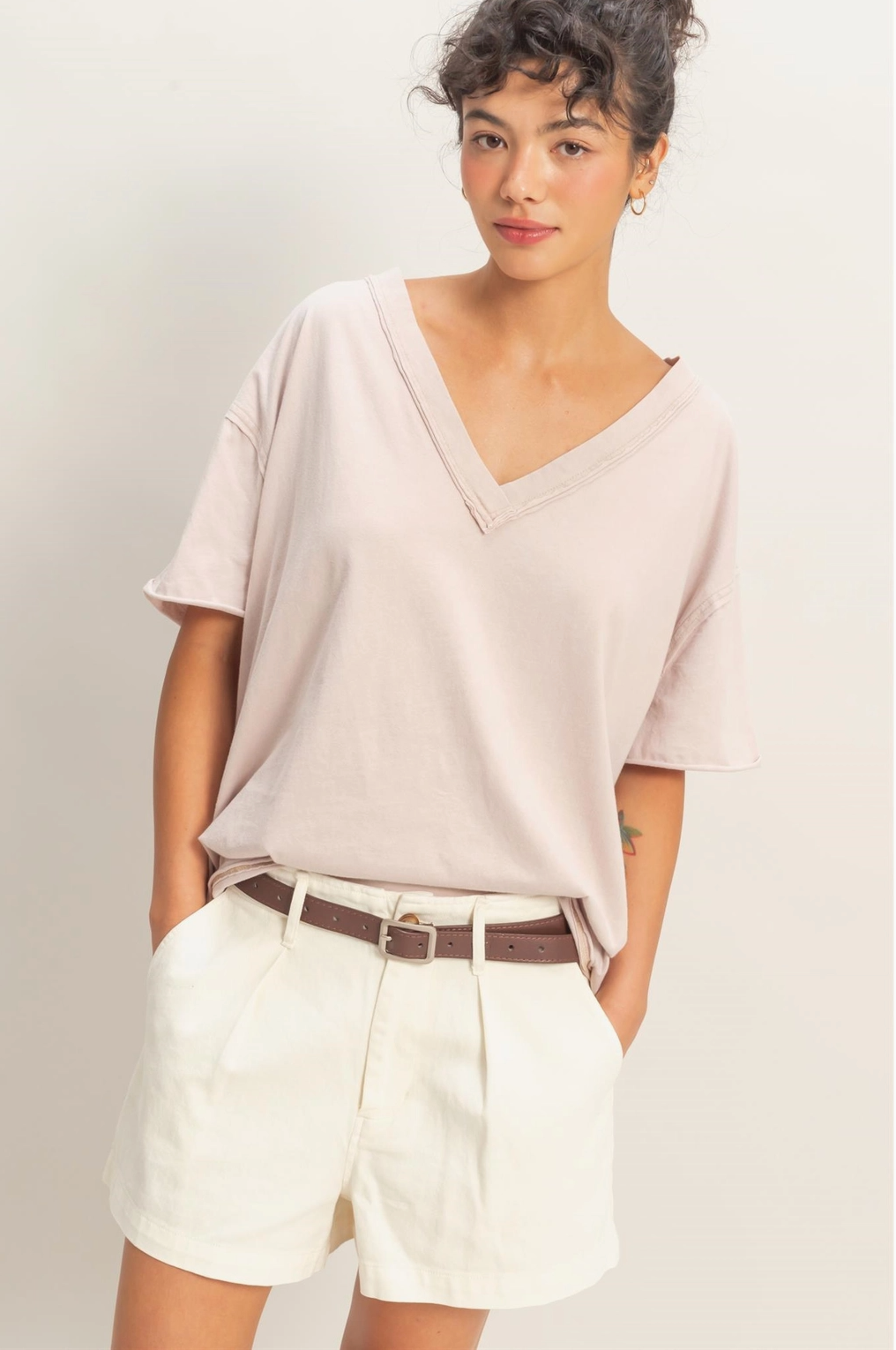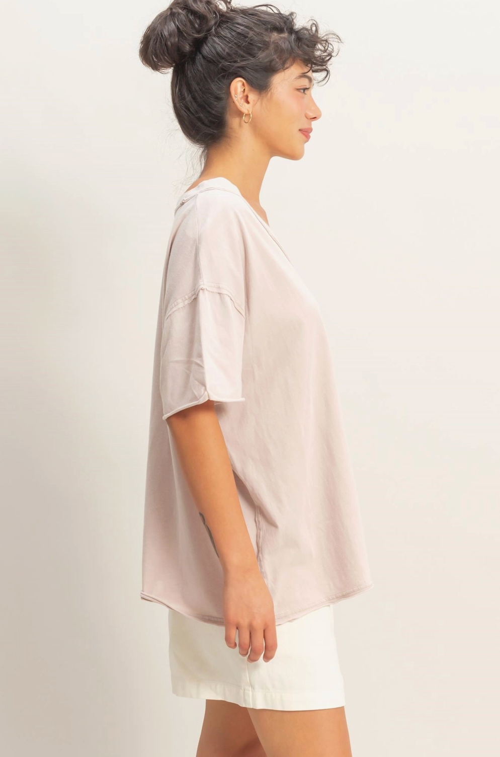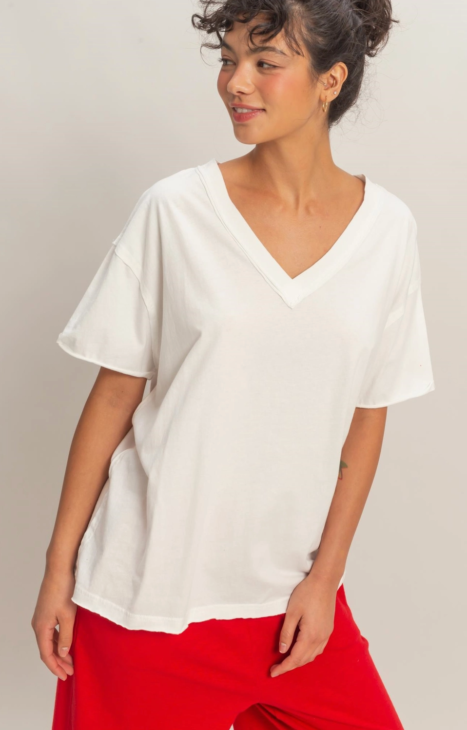 This T-shirt is crafted from soft cotton with a vintage wash finish. The design features a deep, raw-edge V-neckline. a center back seam, exposed seams, and comfortable, wide sleeves. The cut is an oversized, boxy fit finished with a raw edge hemline.Pair with jeans and sneakers for an effortlessly chic and casual style.