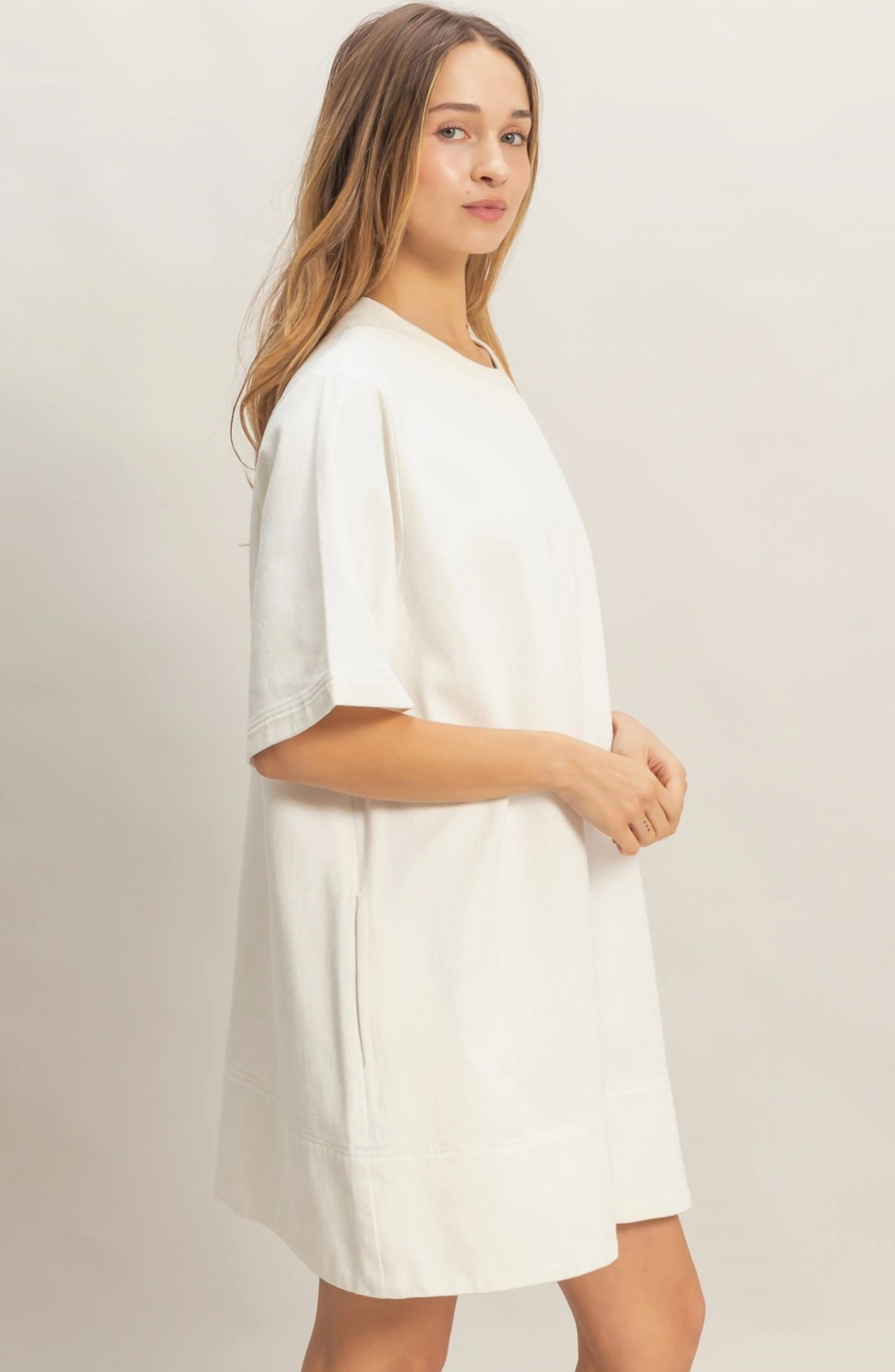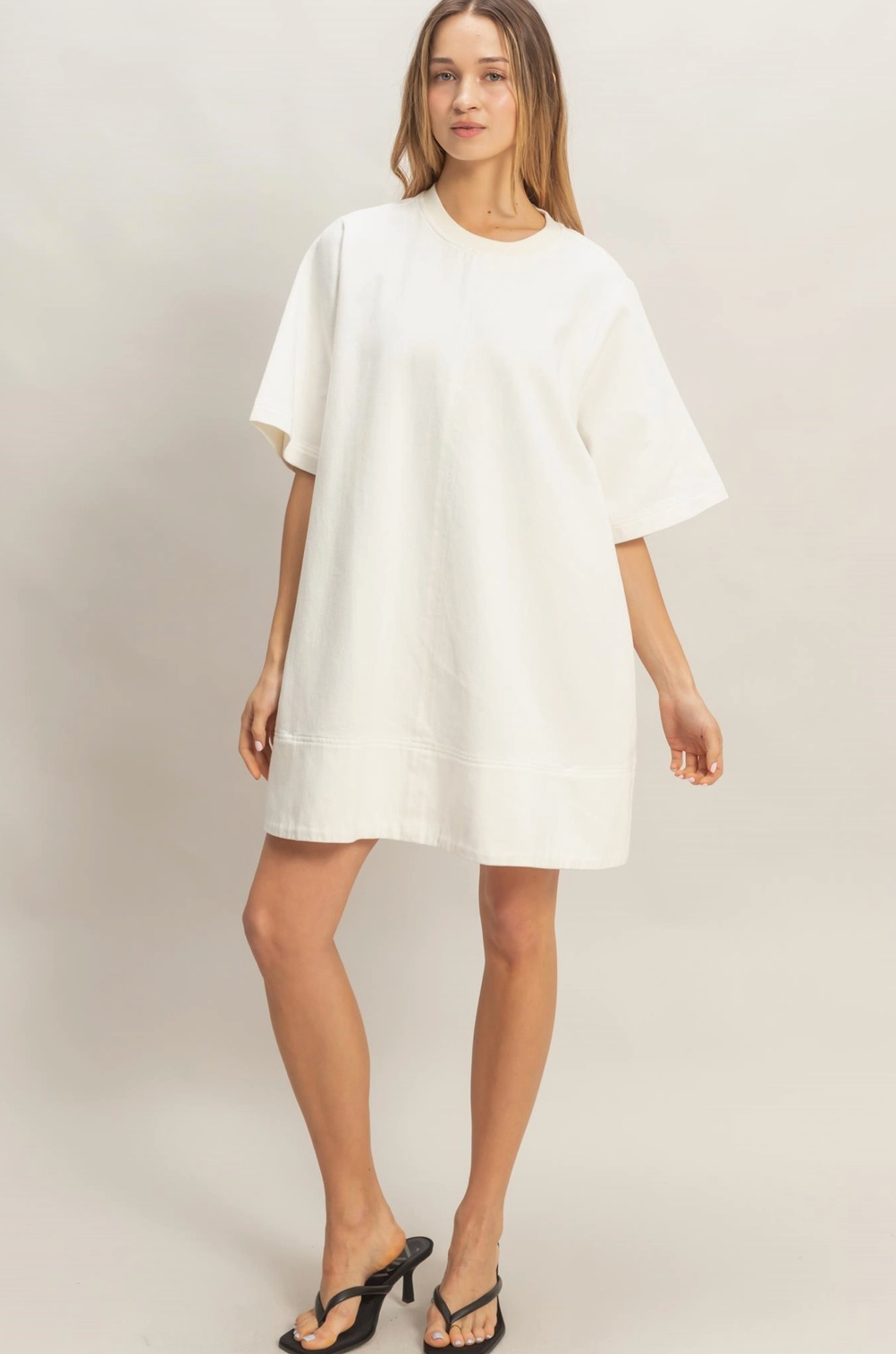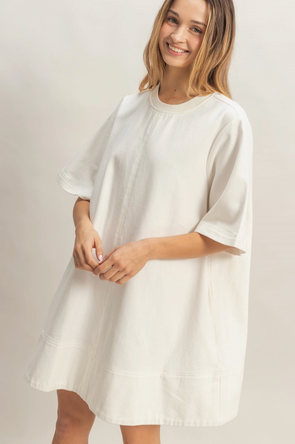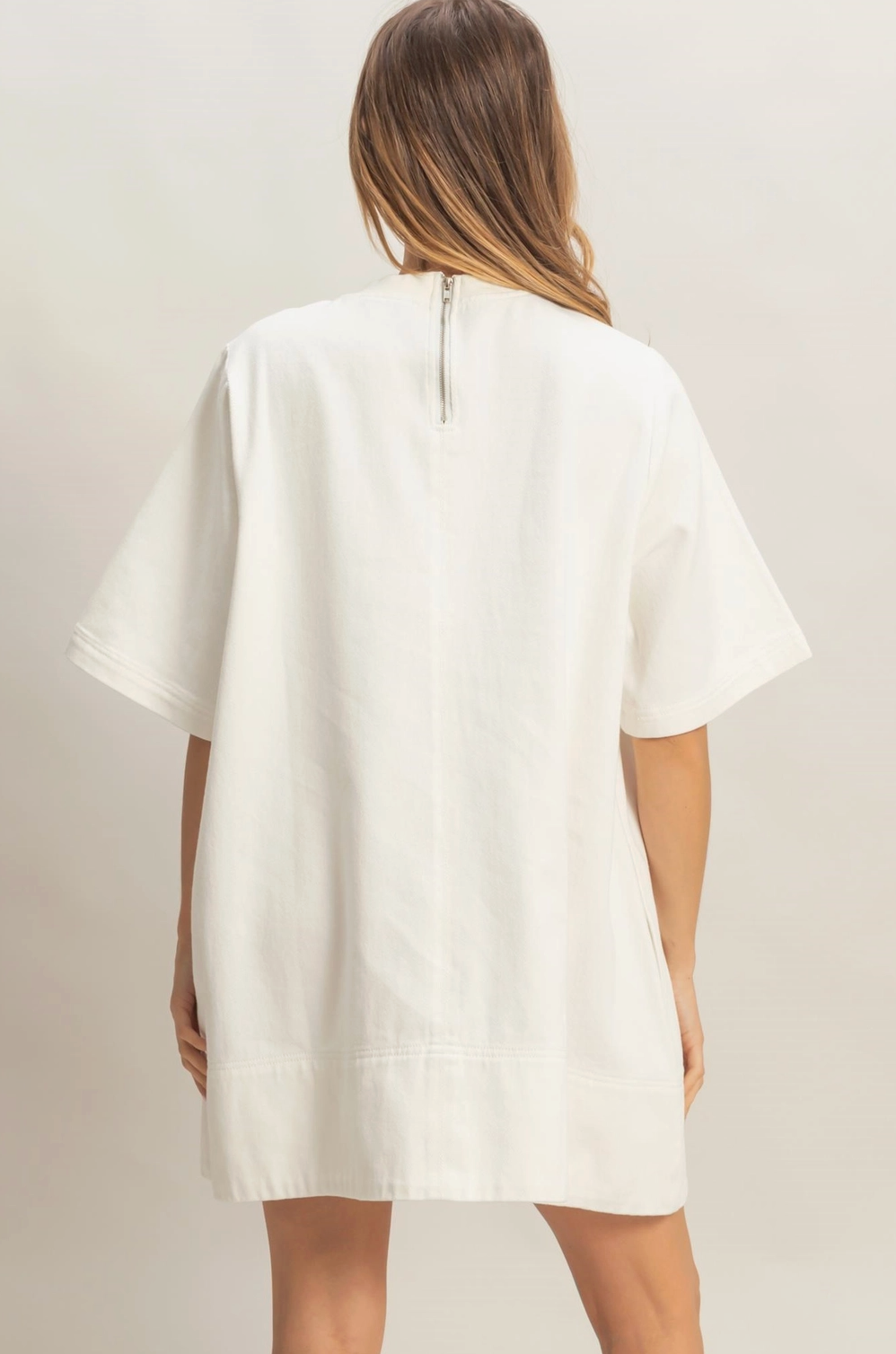 A denim dress featuring a crew neckline and a loose, flowing silhouette with short sleeves. Highlighted by its unique snow garment wash, this piece pairs perfectly with tights and ankle boots for a chic daytime ensemble. 100% cotton , white 80% cotton 20% polyester Model Is 5' 8" Tall, 32" Chest, 24" Waist, 34" Hips And Wearing A Size Small