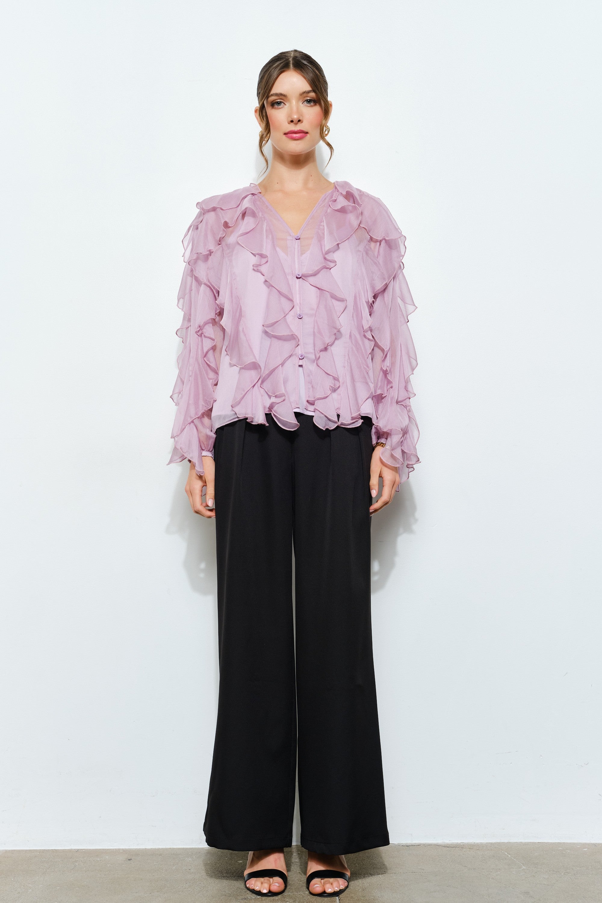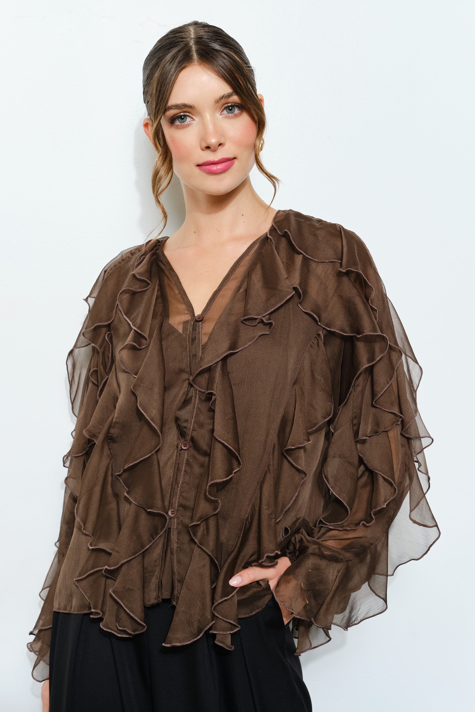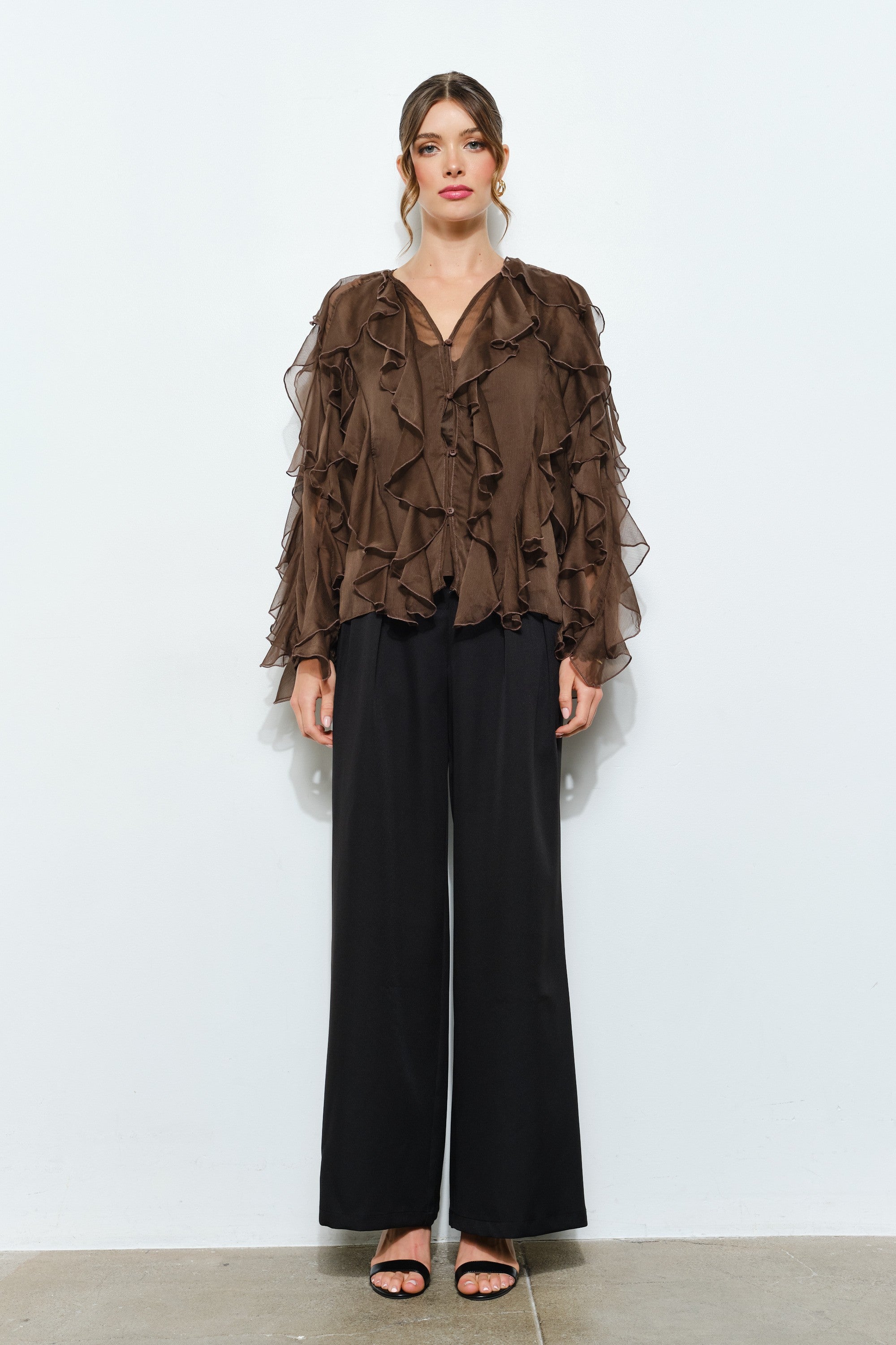 Layered Ruffle Sheer Chiffon Button-Up Blouse
