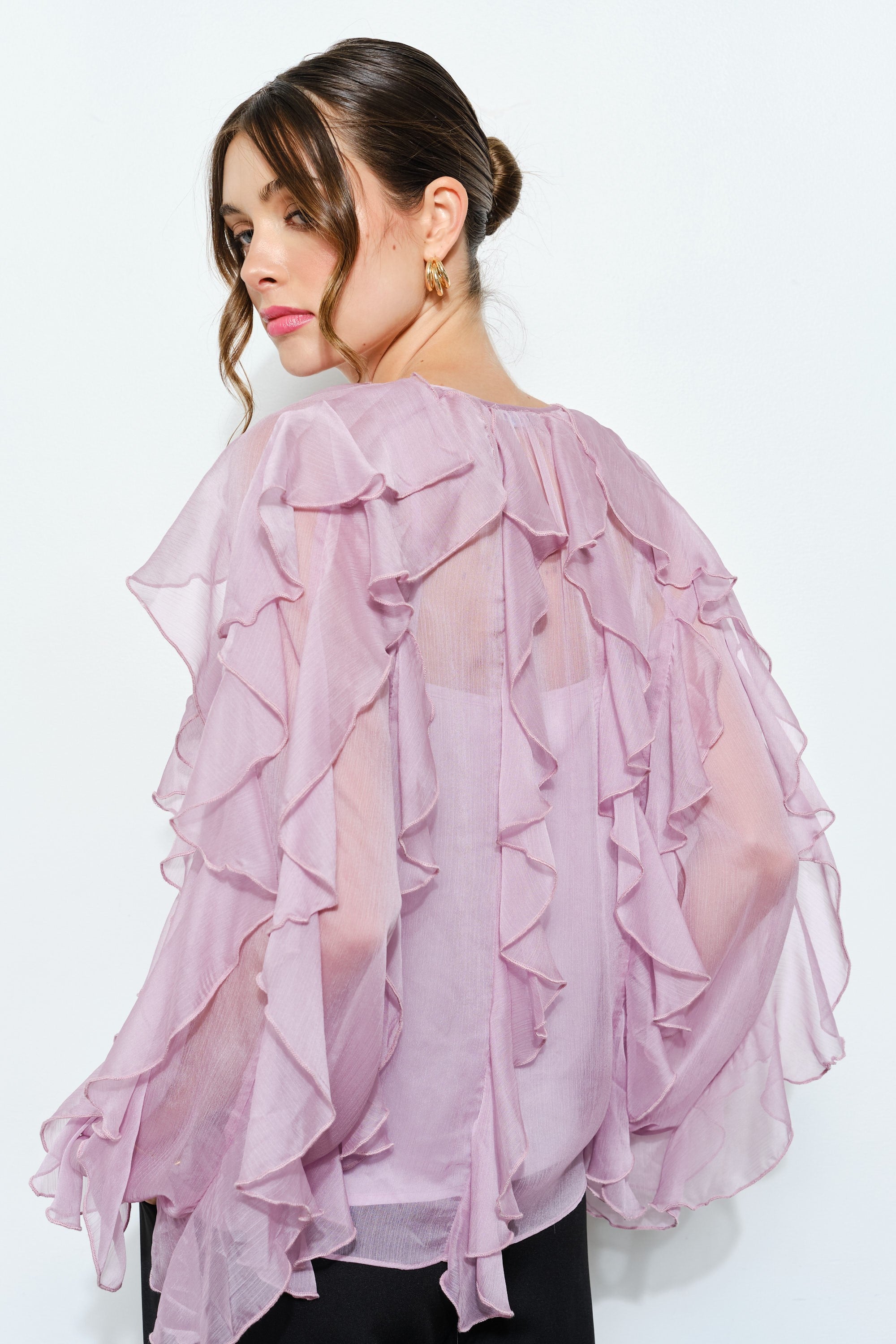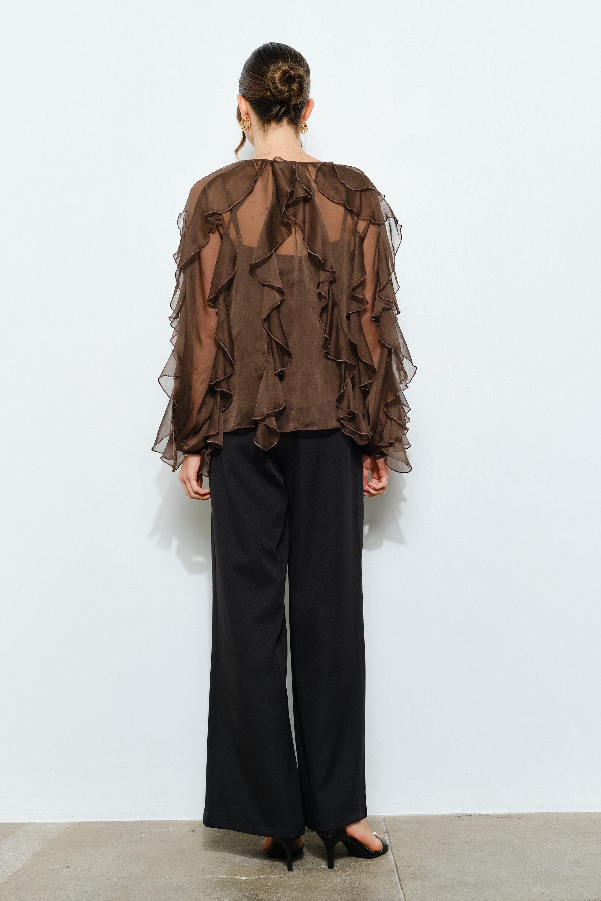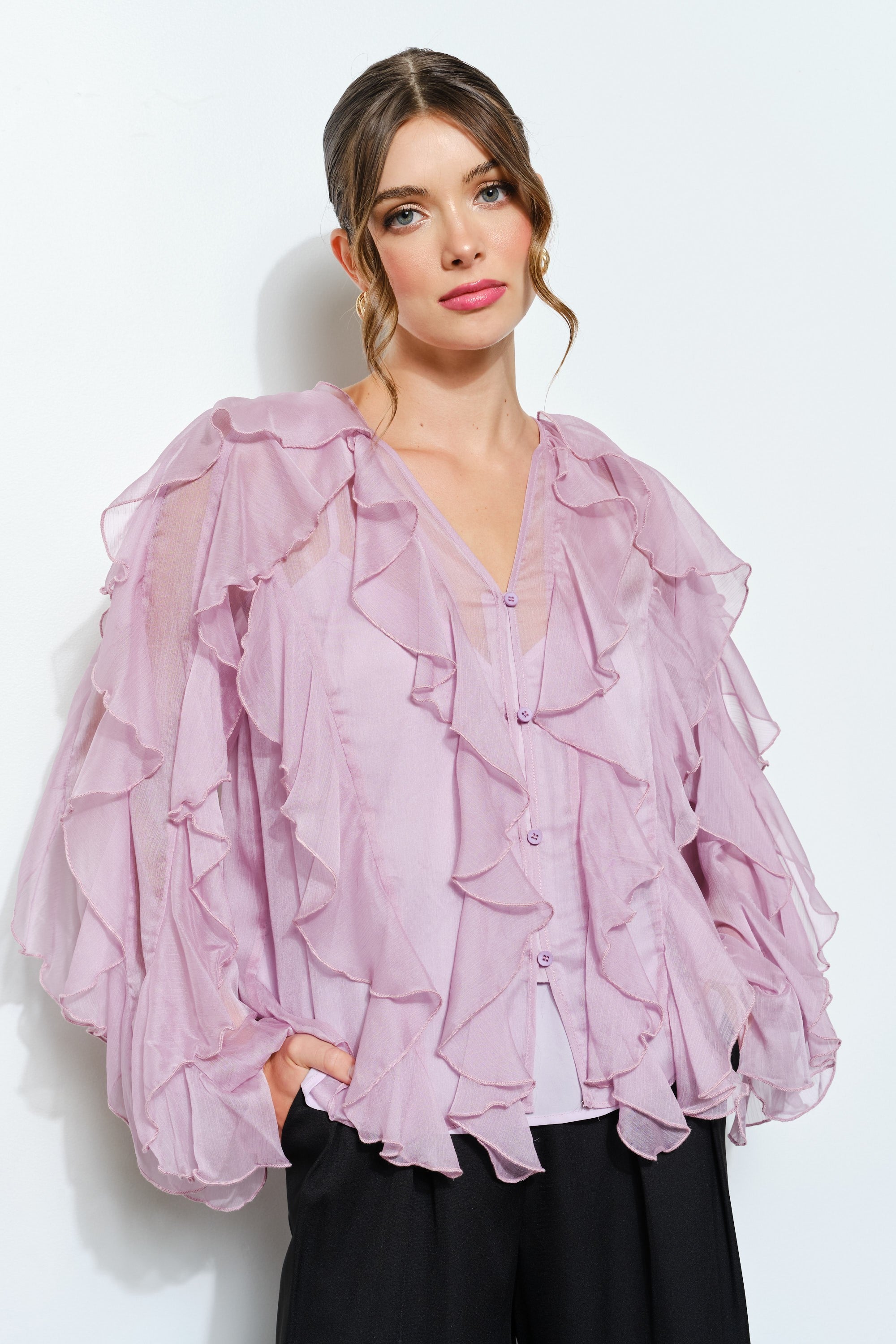 Layered Ruffle Sheer Chiffon Button-Up Blouse