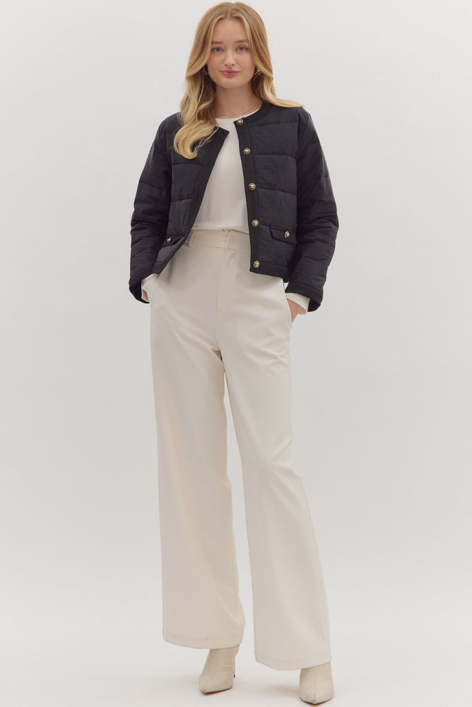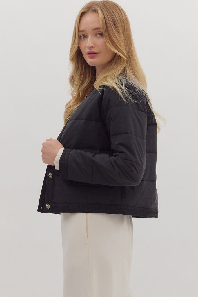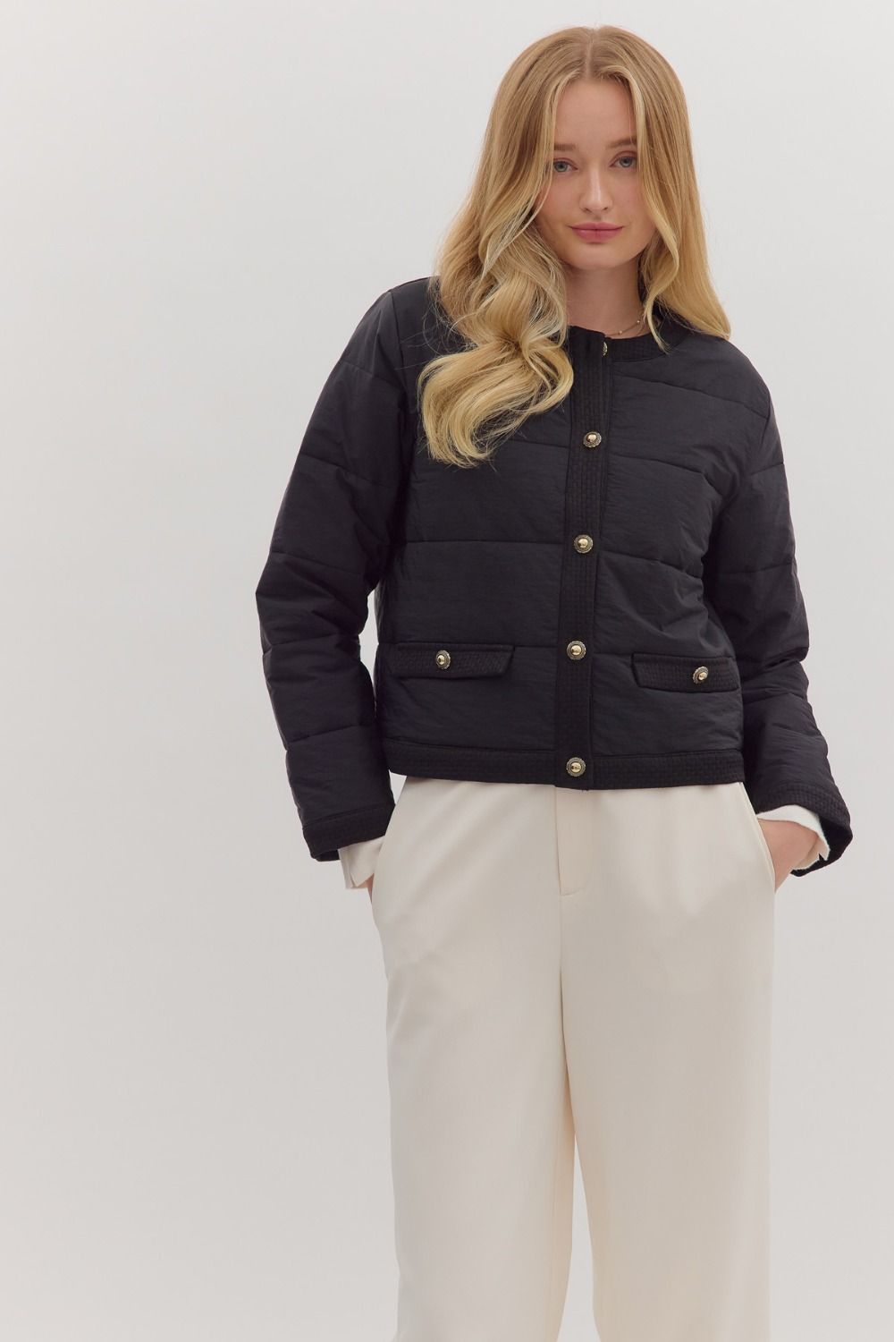 Solid long sleeve quilted jacket. Non-functional flap pockets. Button closure at front. Unlined. Woven. Non-sheer. Medium weight.