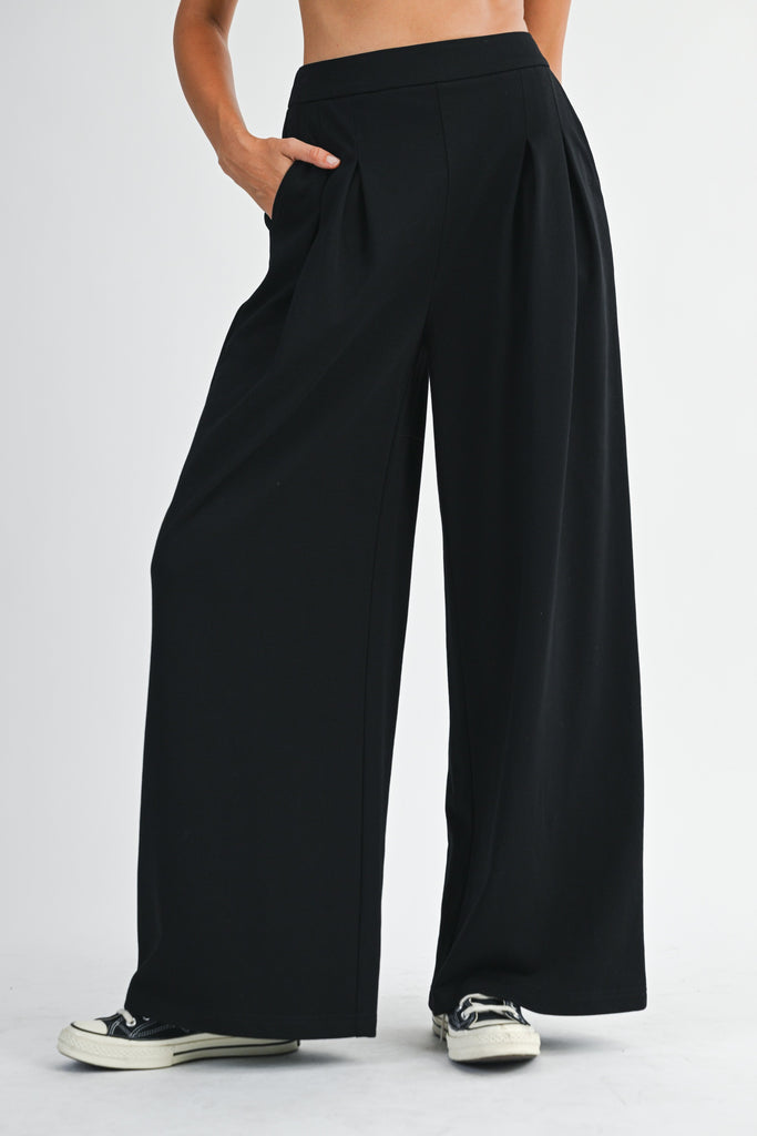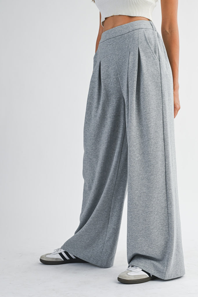 Solid front pleated wide leg sweatpants with side pocket detail.