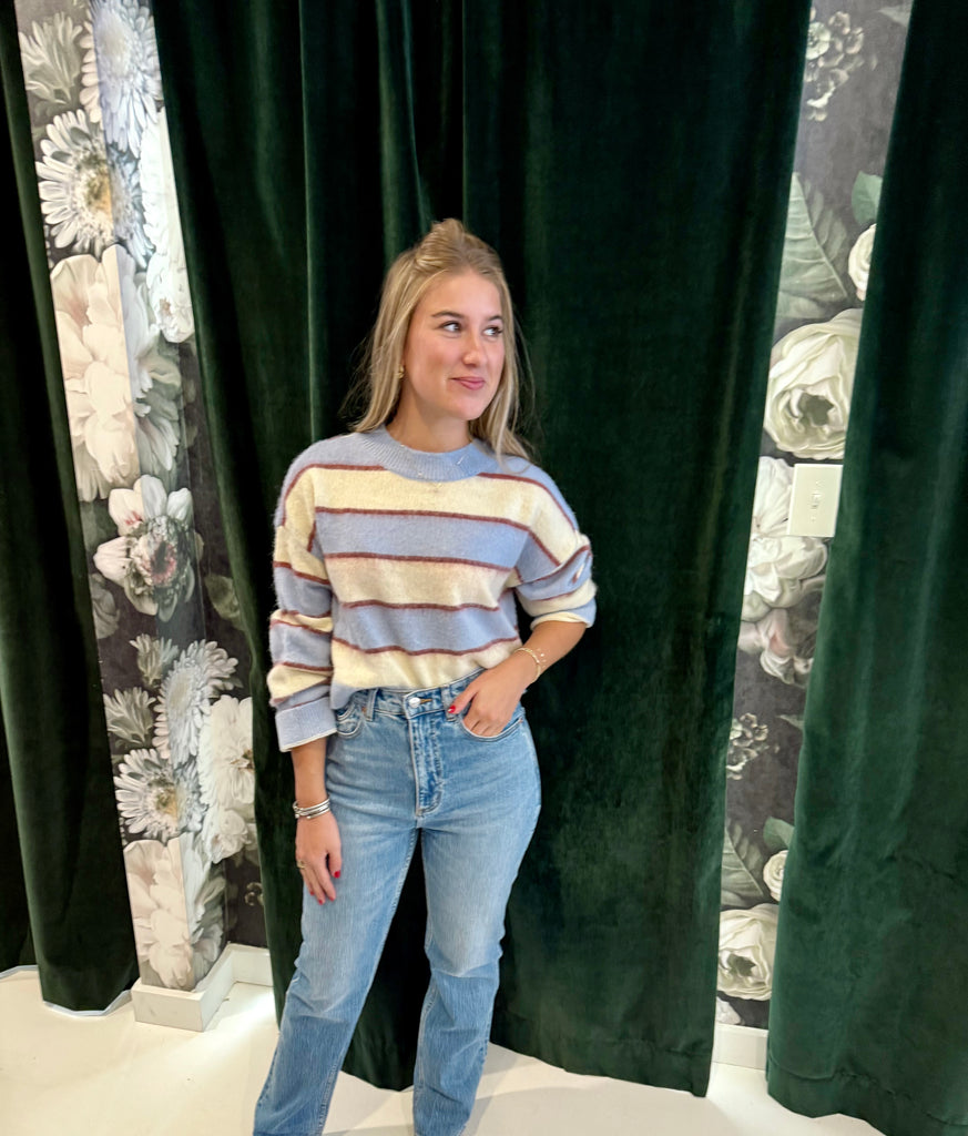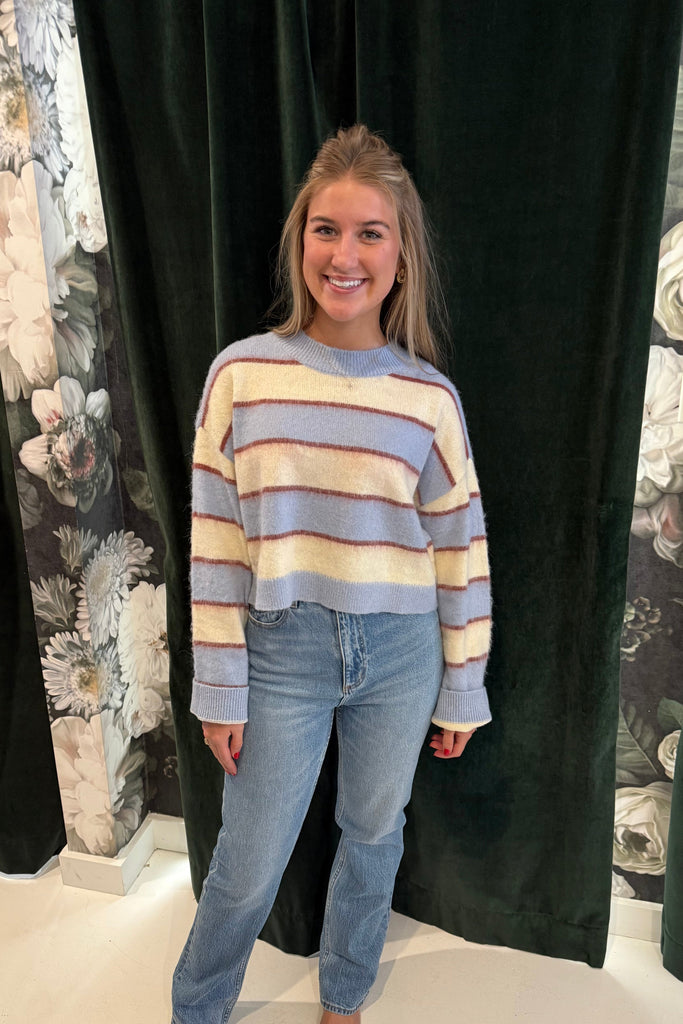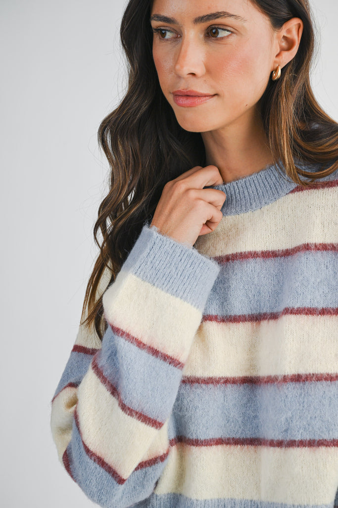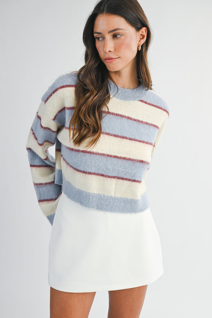 Fuzzy multi color striped knit long sleeve crop sweater top.