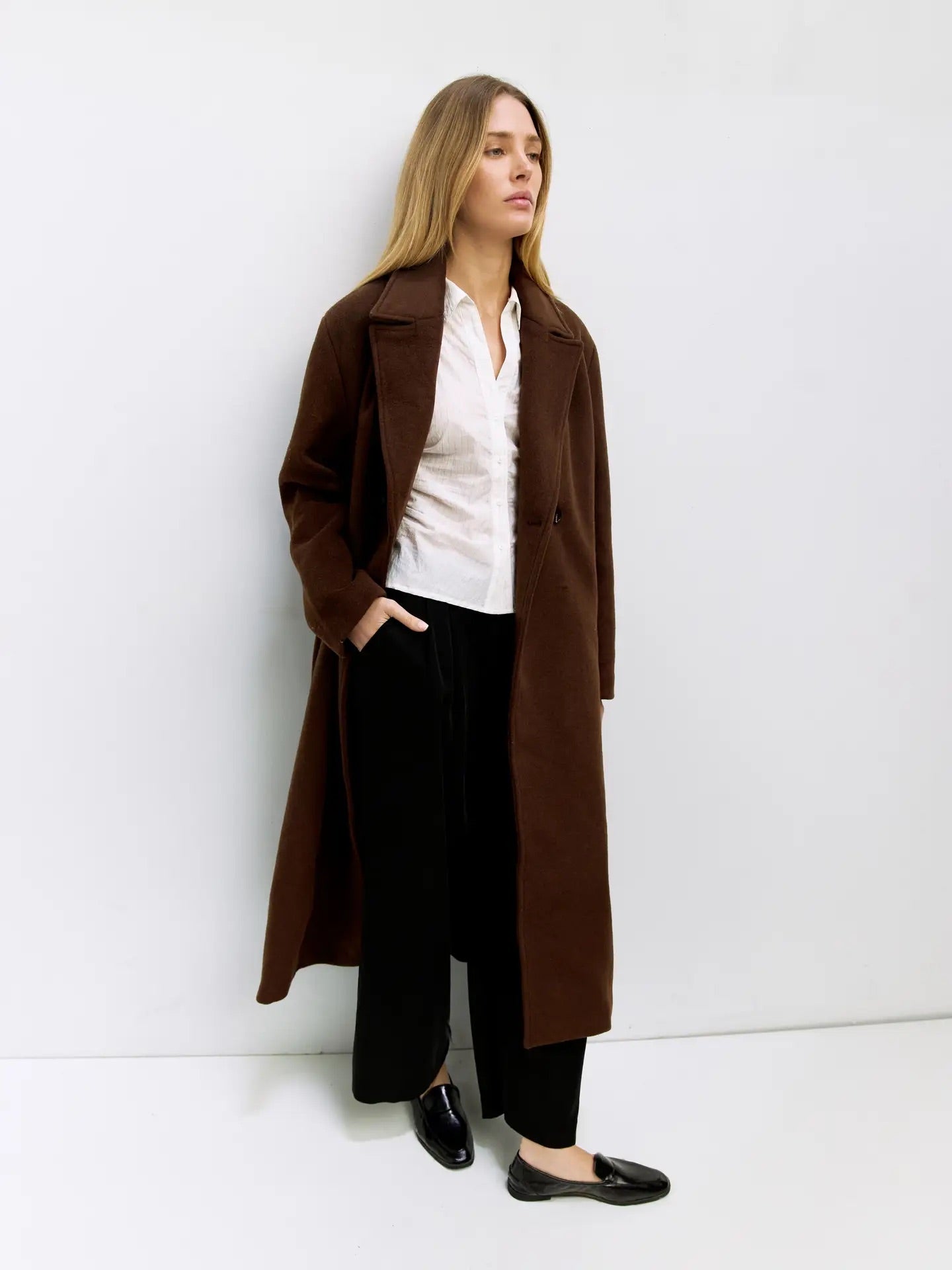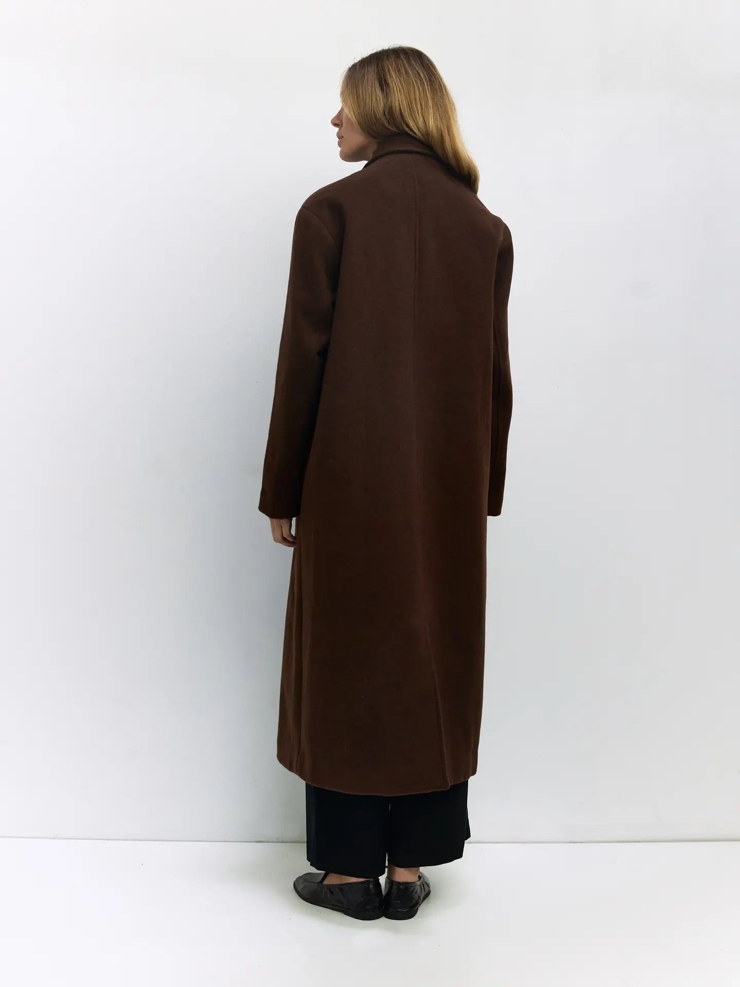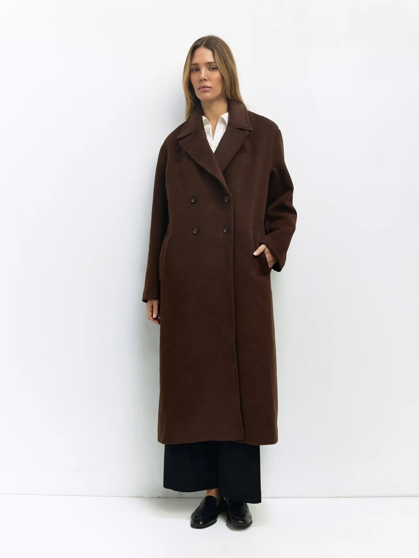 The Karoline Coat is a heavyweight felted wool blend trench designed with a classic double-breasted silhouette, full front button closure, and oversized lapel collar. Fully lined and cut to a traditional trench length, it provides timeless coverage and warmth with long sleeves for added comfort.