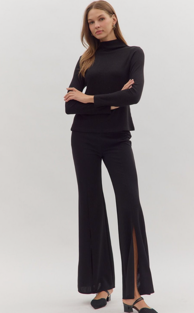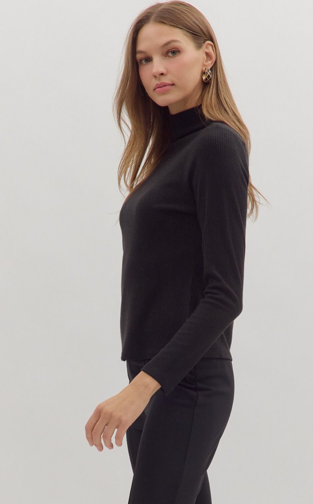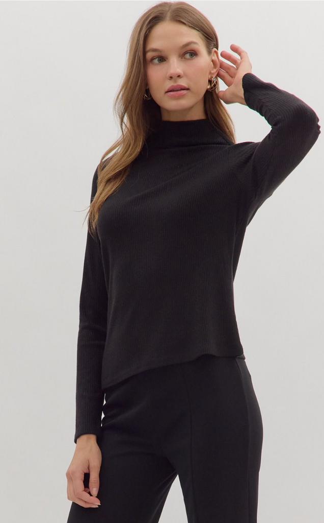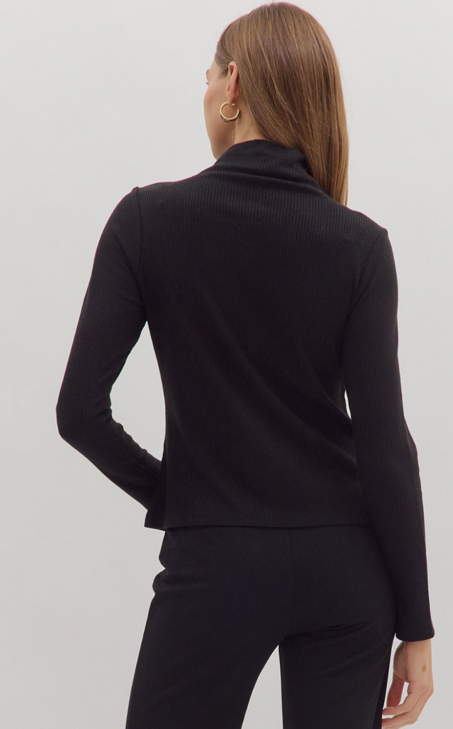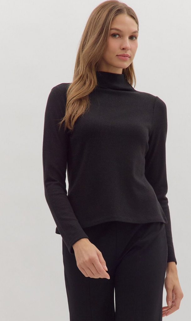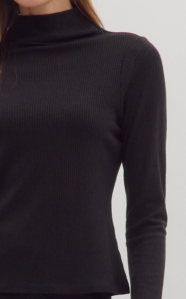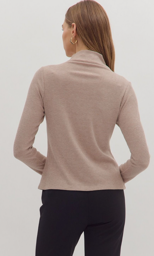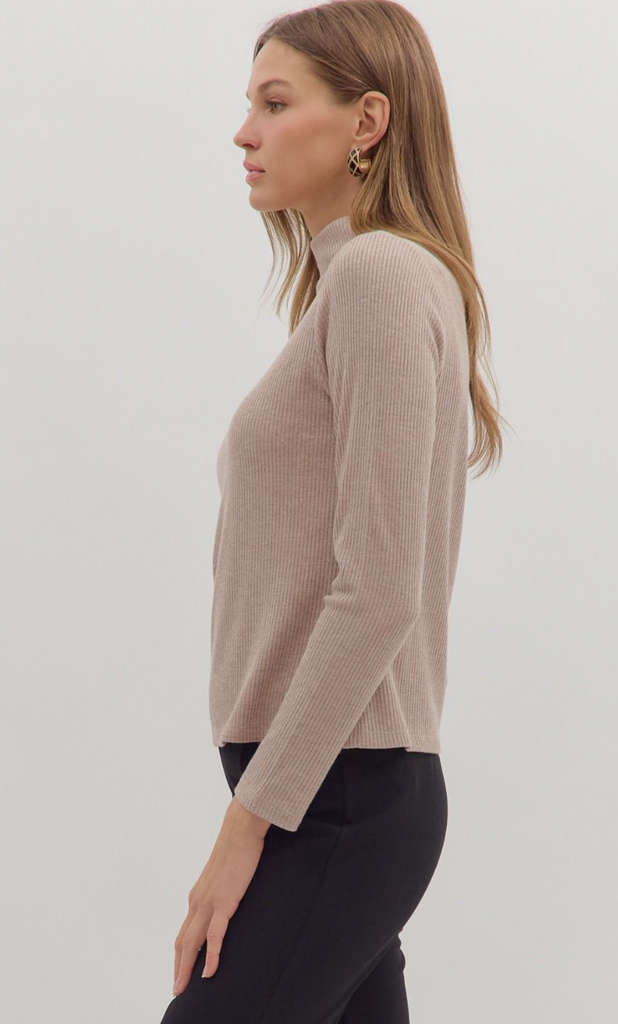 Solid long sleeve ribbed sweater knit top featuring mock neck. Unlined. Knit. Non-sheer. Medium weight.