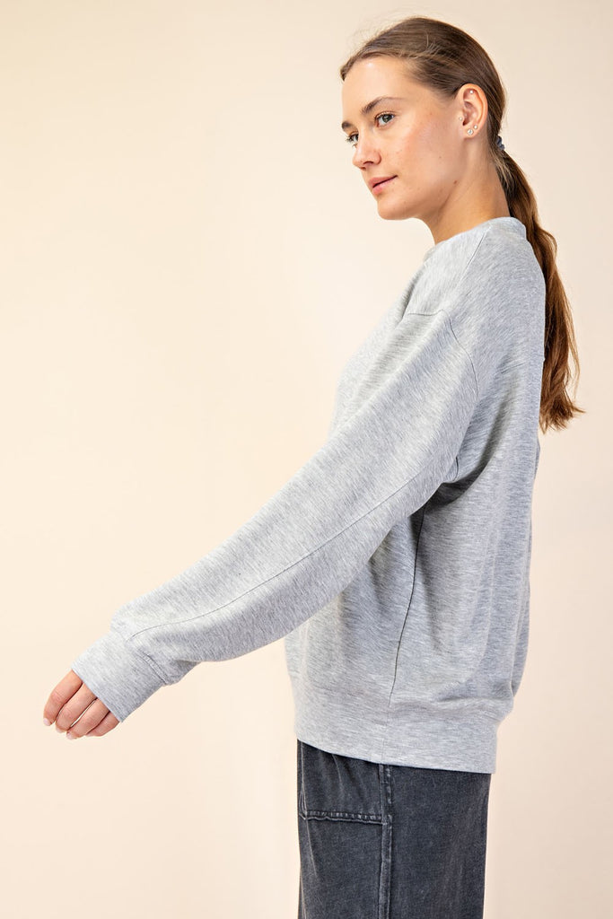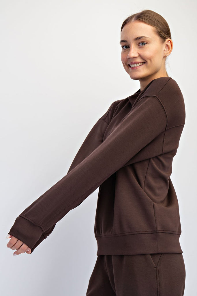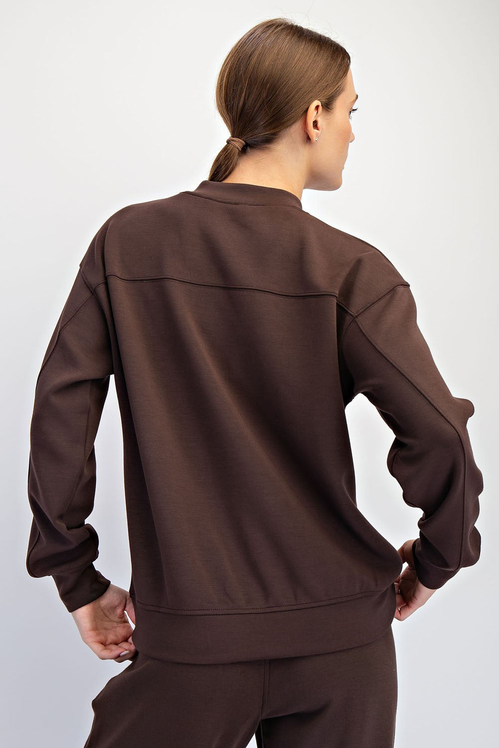 Features: - Modal Poly Span Scuba fabric - Silky smooth and Lightweight - Relaxed fit / Oversized - Mock Neck - Pullover - Seamed details Model is 5'9" and wearing size Small.