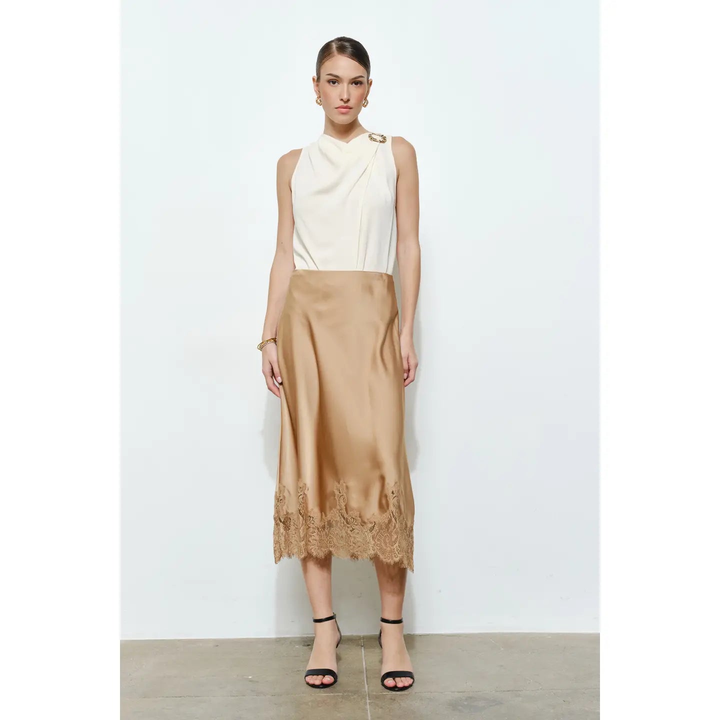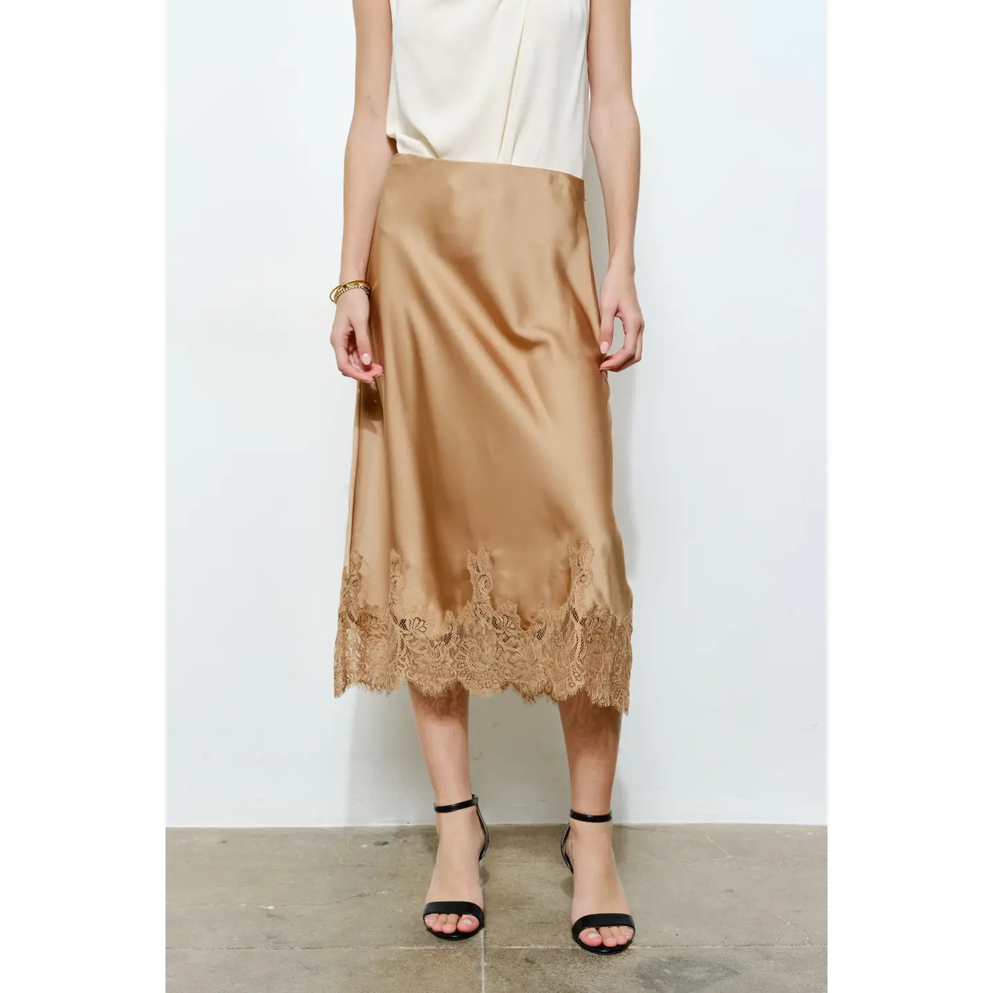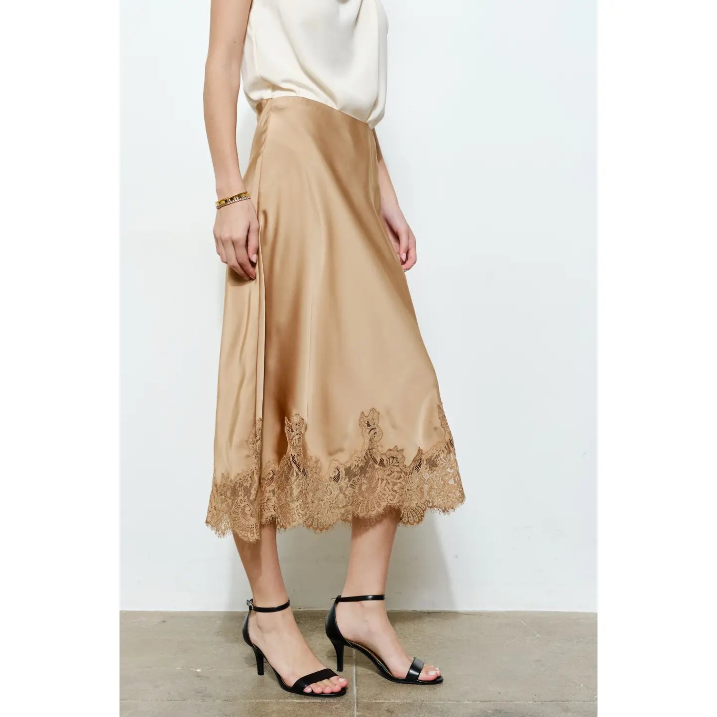 Classic Silky with Lace Hem Contrast H-Line Midi Skirt -Elegant silky lace hem skirt -Contrast lace midi skirt -Chic H-line office skirt -Silky lace trim midi skirt -Classic feminine lace skirt -Model is 5'9.5" and is wearing a size small SELF:100%POLYESTER