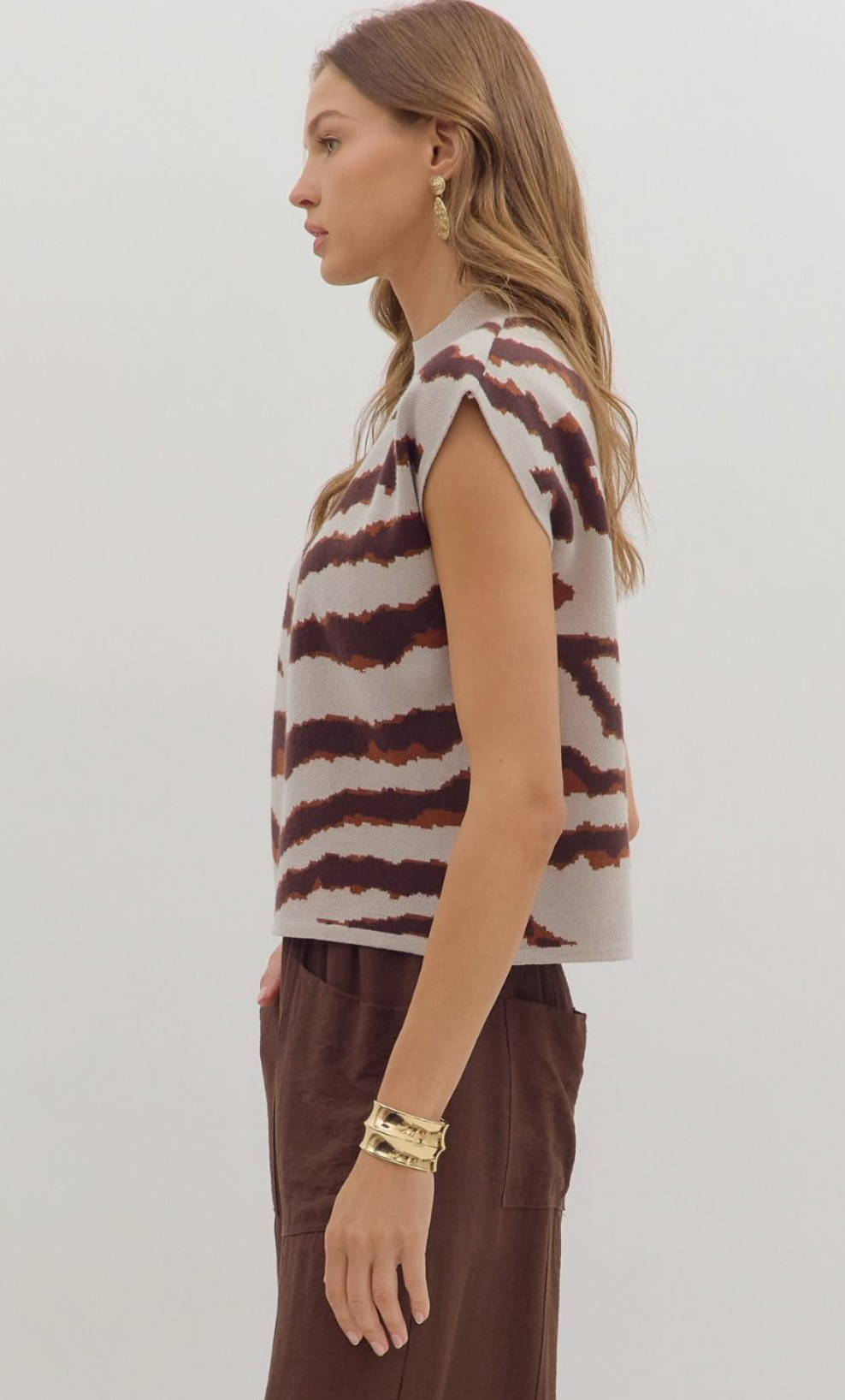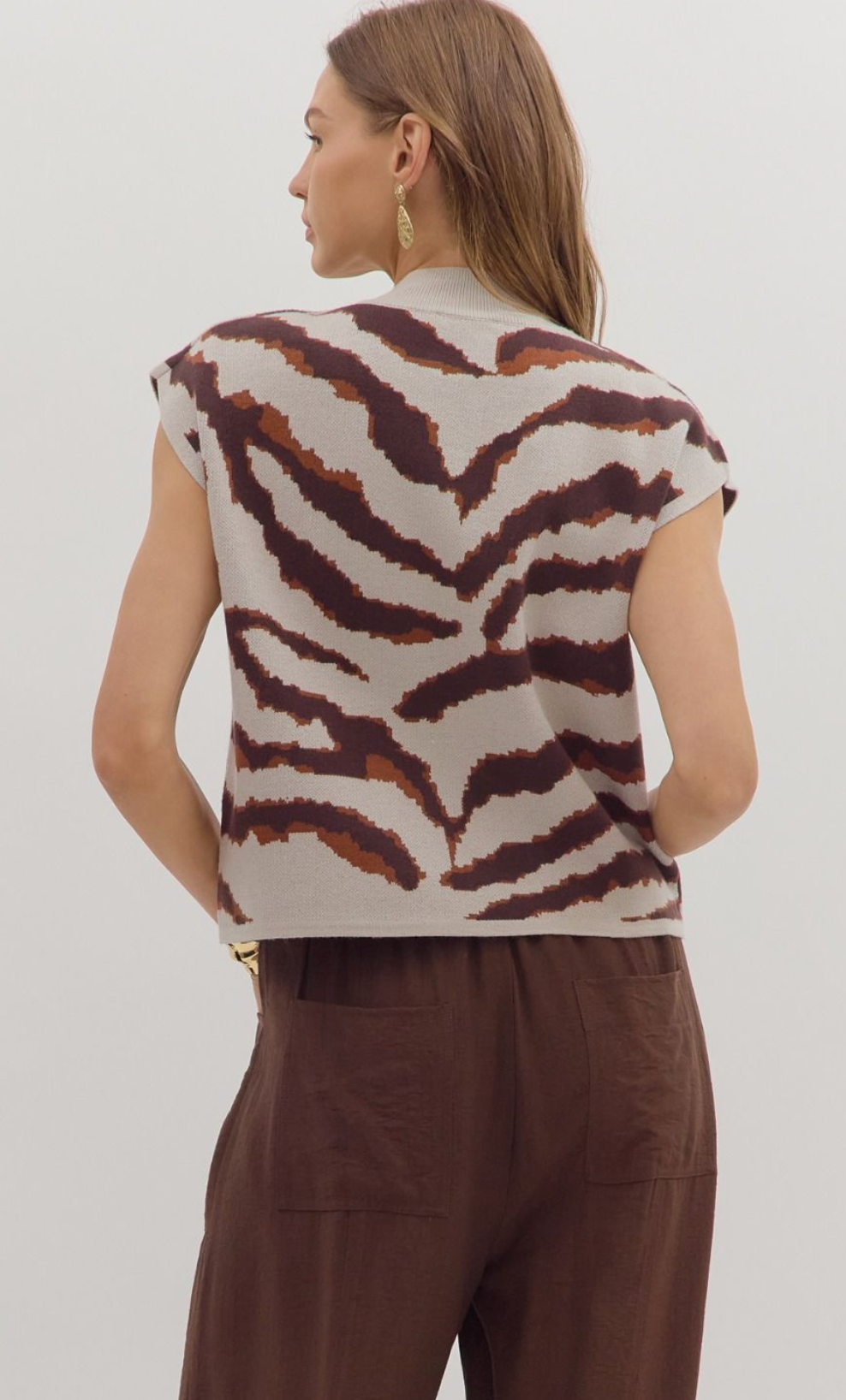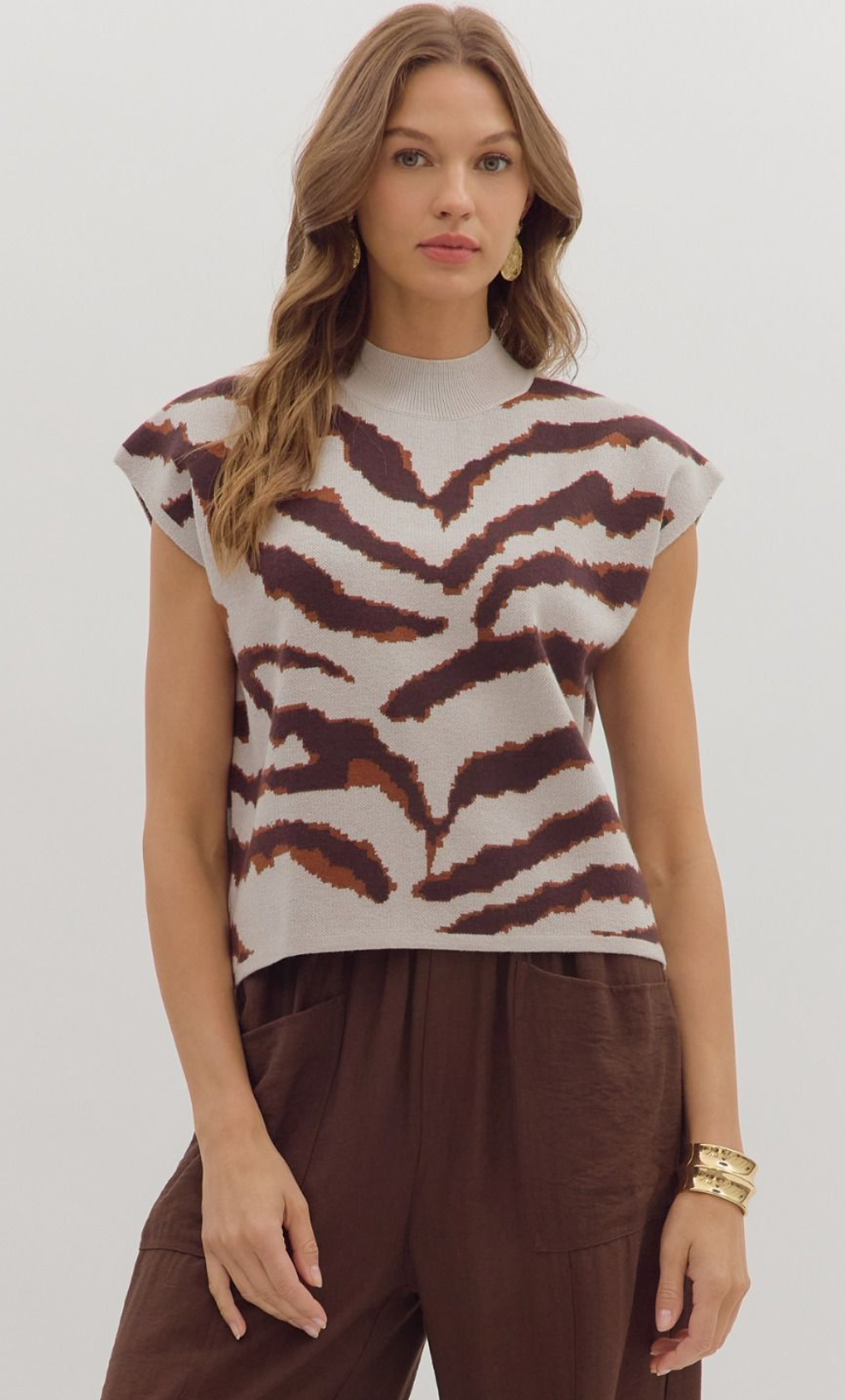 Animal pattern short sleeve mock neck sweater knit top featuring relaxed silhouette. Unlined. Knit. Non-sheer. Medium weight.