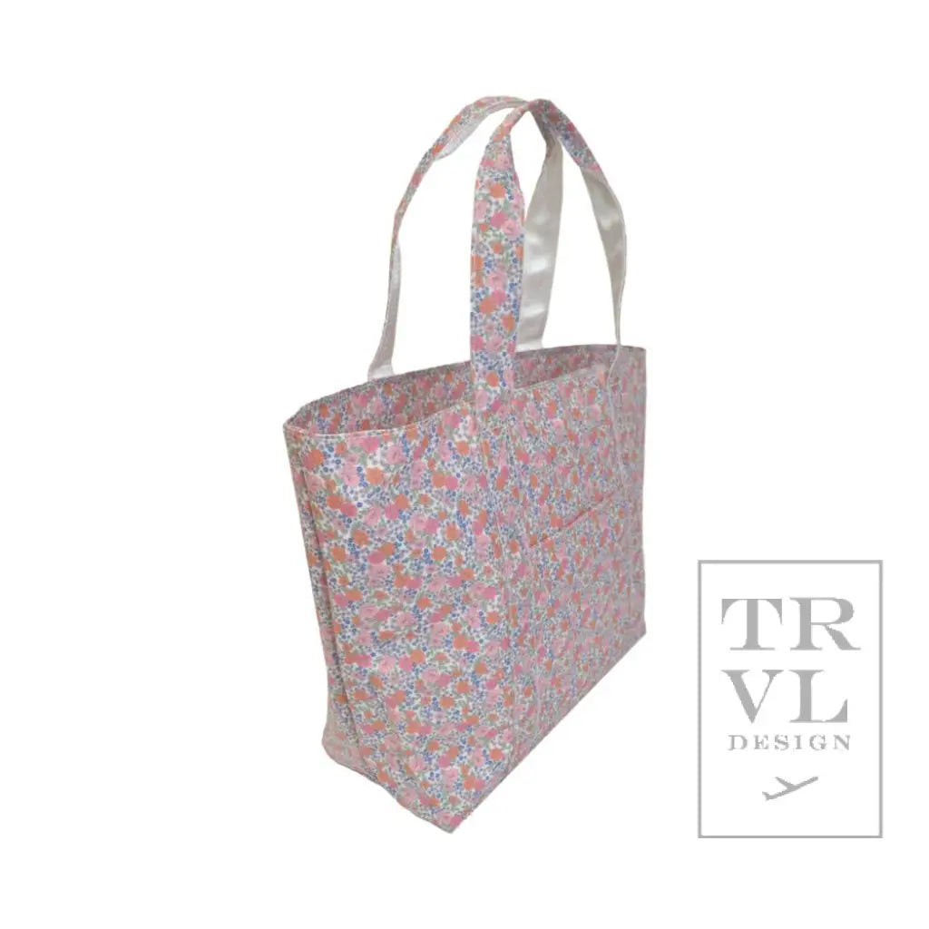Get around effortlessly with our new Jumbo Tote. This do-it-all lightweight tote is useful year-round for all occasions - as a beach bag or for your everyday needs. Underneath the strap are satin webbing designed to prevent slipping, an interior full slip pocket and zip pocket, a front exterior pocket, and an exterior trolley passthrough. * Size: 16.25"l (base) x 15"h x 7"d x 23"l (top) * Handle drop: 10" * Made in our Custom Print Signature Coated Cotton with an exterior slip pocket & trolley passthrough * Lined in poly twill with interior zip pocket & wall slip pocket * Drop-in collar with Chunky White Zipper closure * Water and stain resistant & wipeable inside and out * Care: wipe with a clean damp cloth or machine-wash delicate and line dry