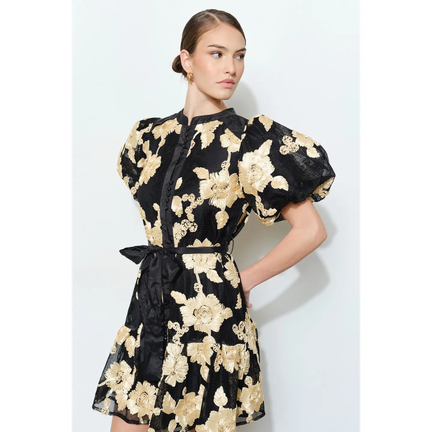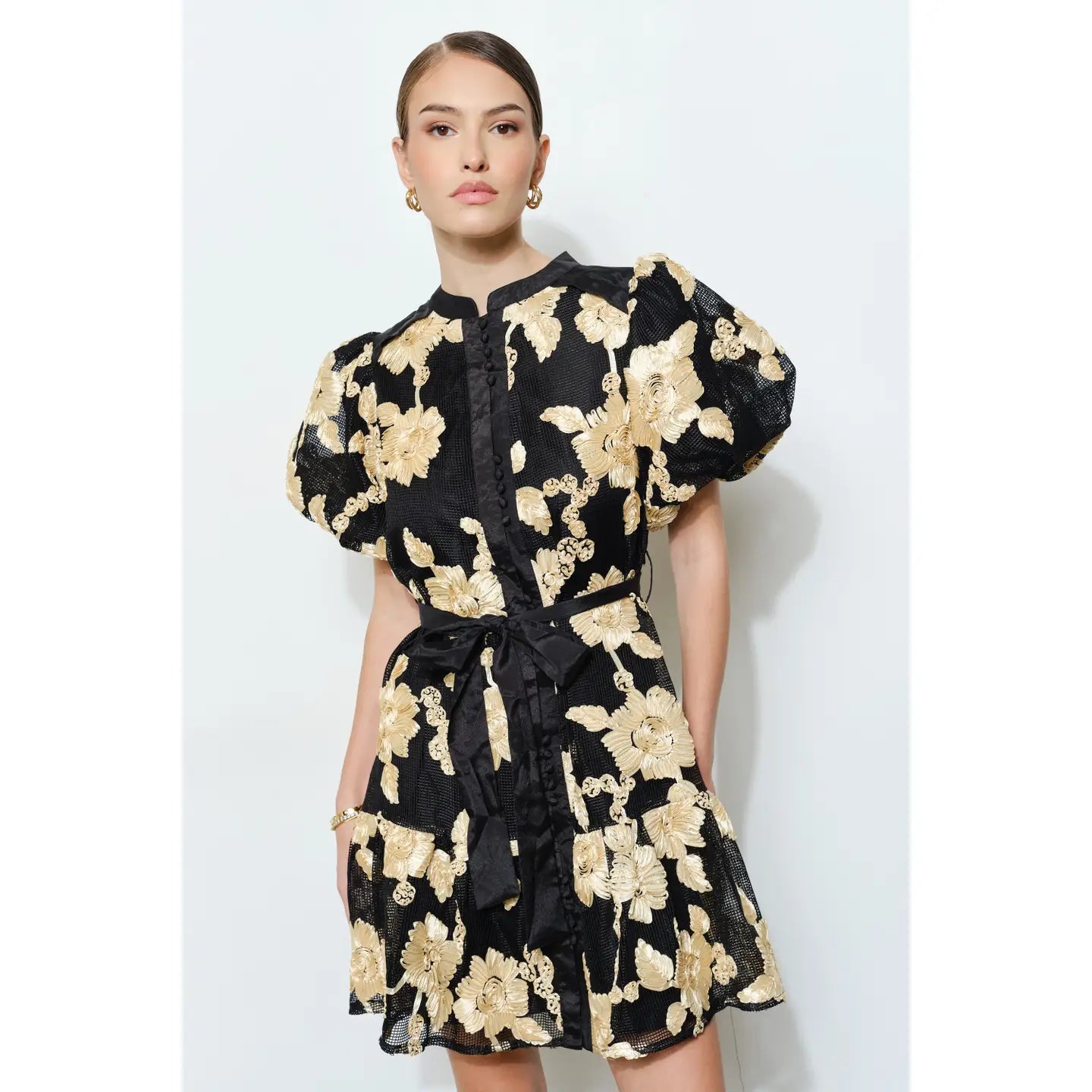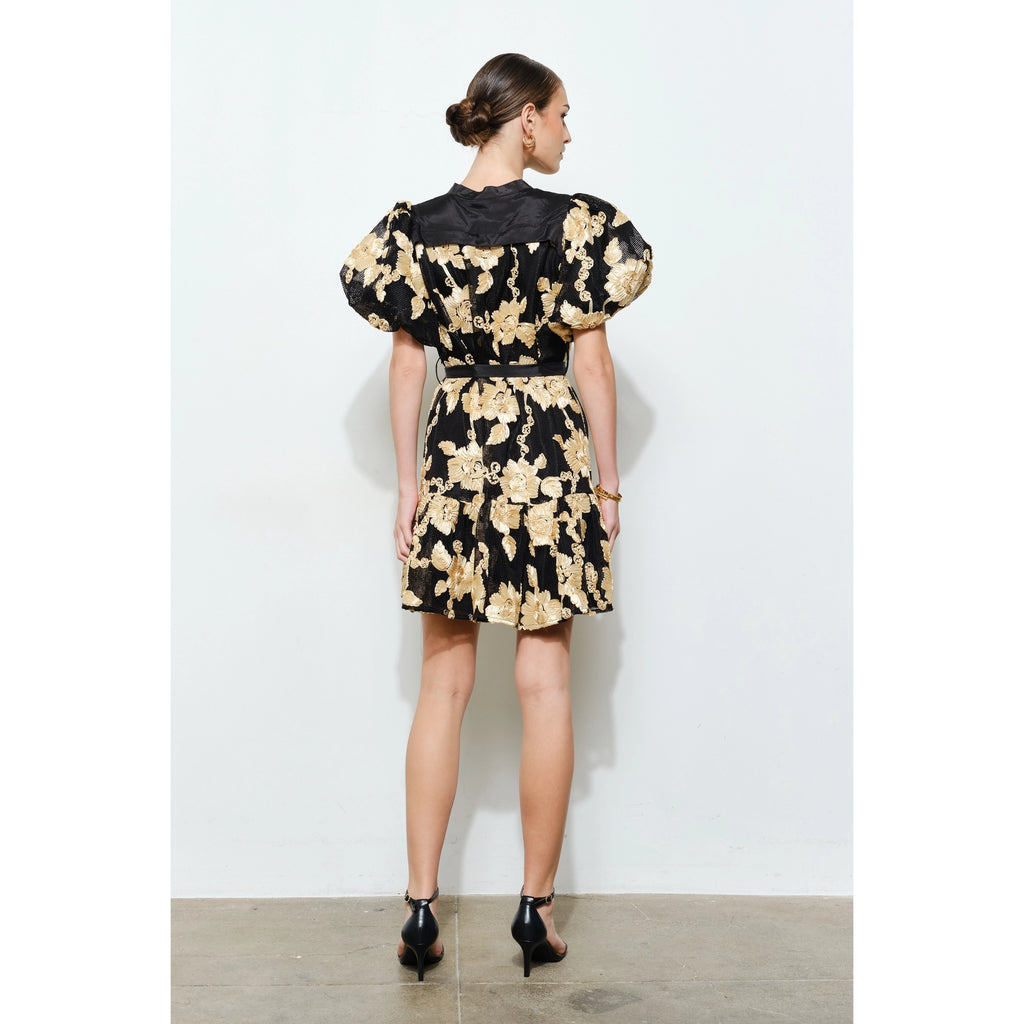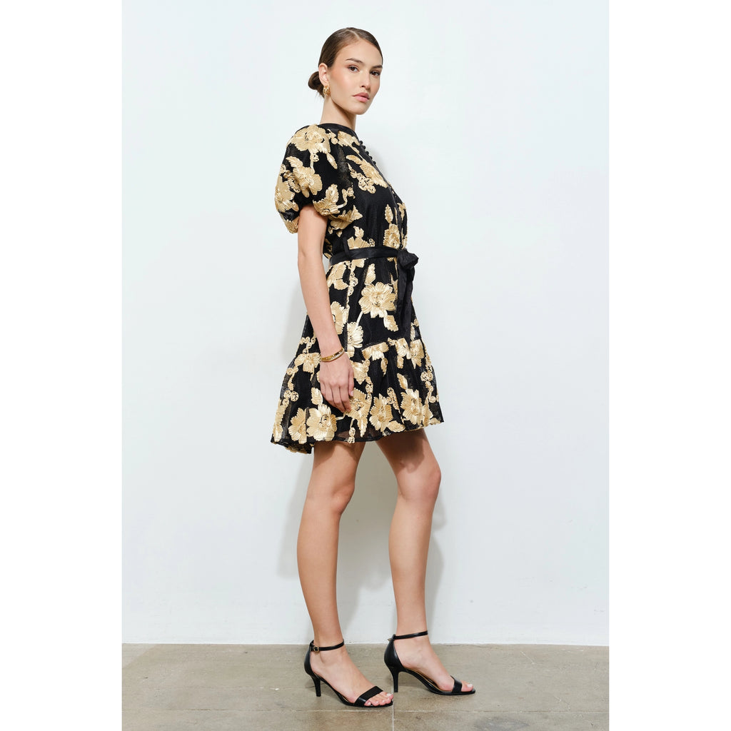 Elegant Floral Lace Fishnet Button Down w/ Waist Tie Bubble Short Sleeves Ruffle Tiered Lining Mini Dress -Romantic Lace Dress -Elegant Floral Lace Mini Dress -Cocktail Ruffled Tiered Mini Dress -Feminine Waist Tie Mini Dress -Model is 5'9.5" and is wearing a size small