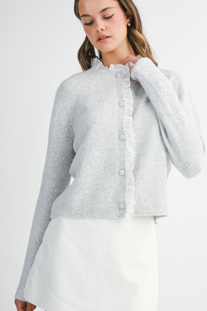Knit long sleeve ruffled woven contrast trim detail button down cardigan.