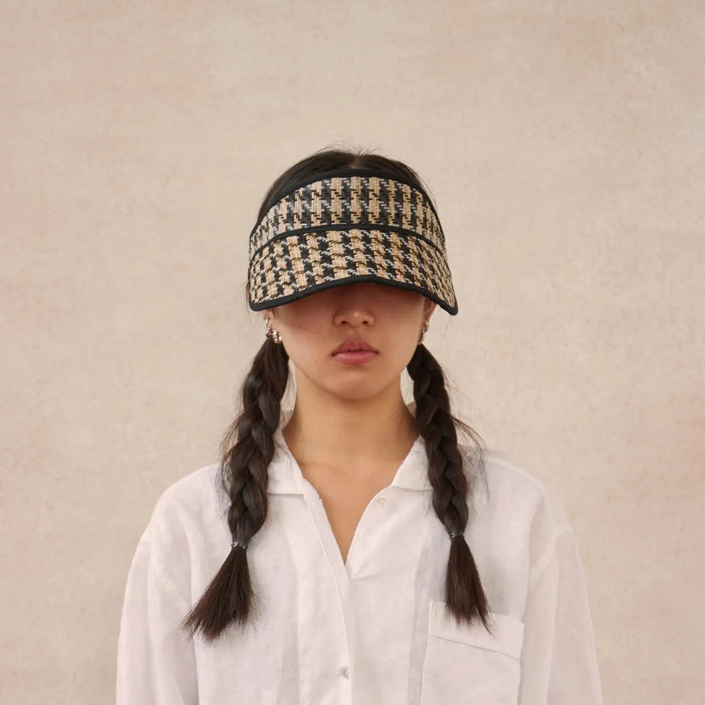 Roma features white and black alternating thread colours woven through its striped natural and black hand-dyed fibre base, with a black fabric trimming and a houndstooth inspired check pattern.