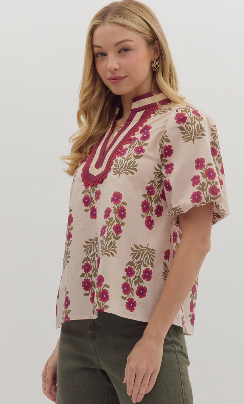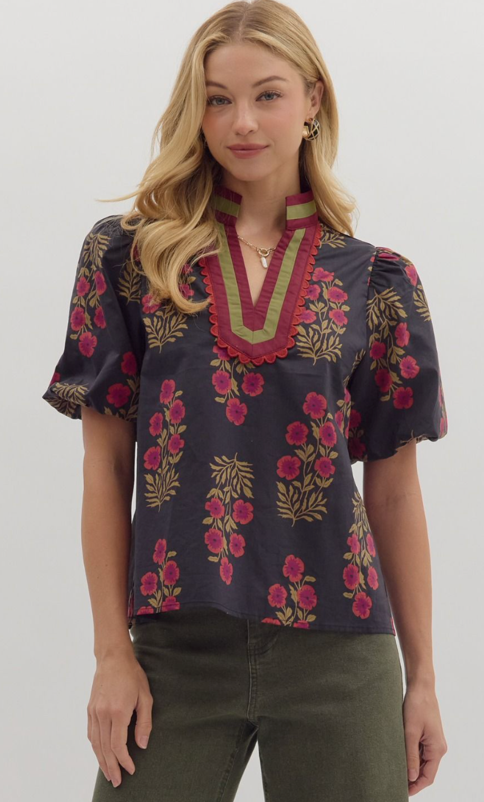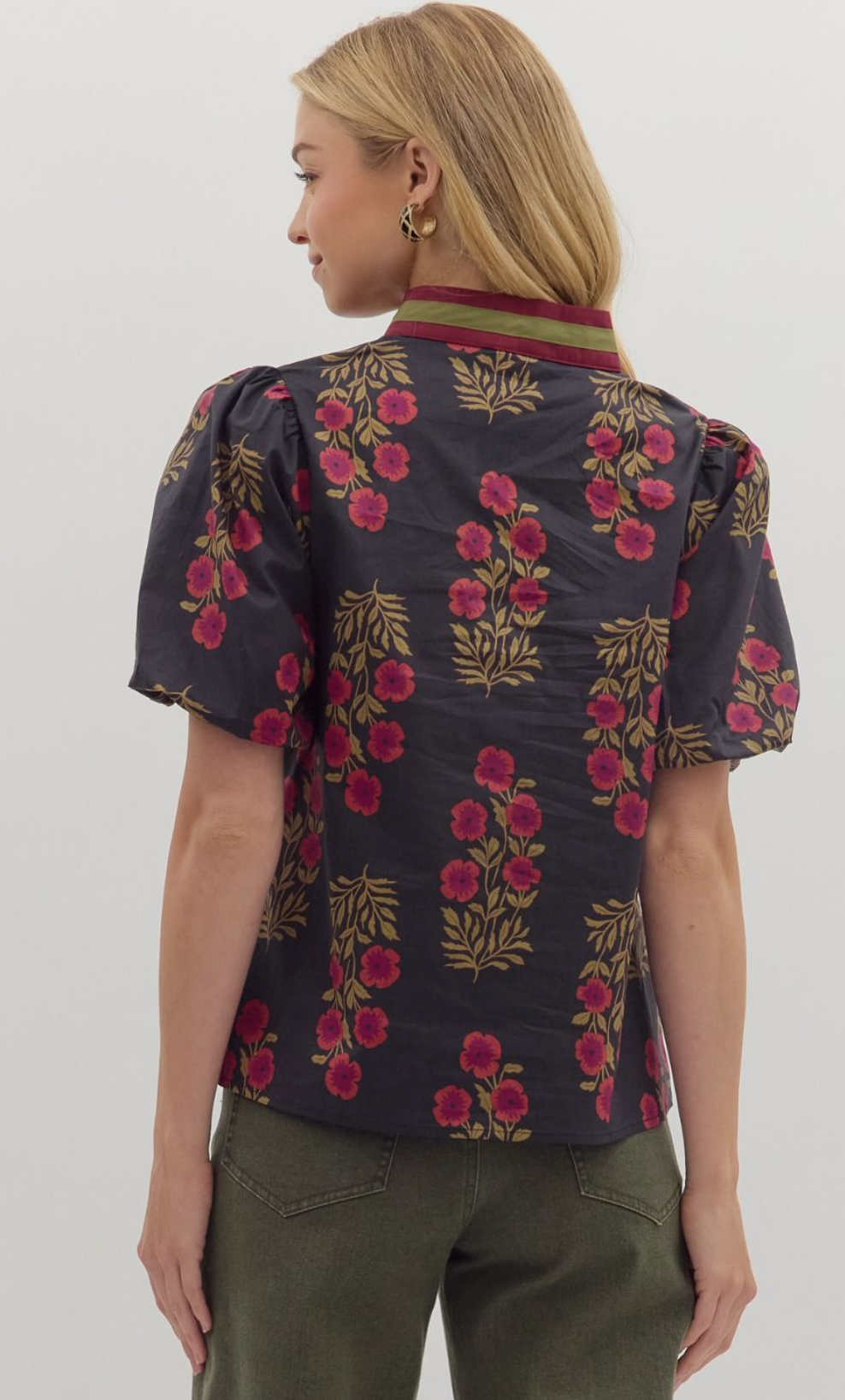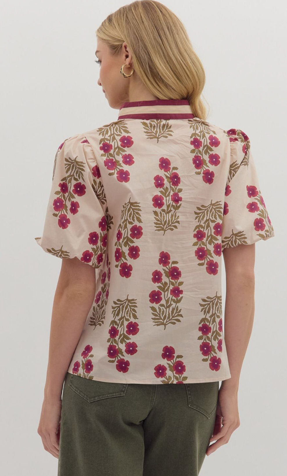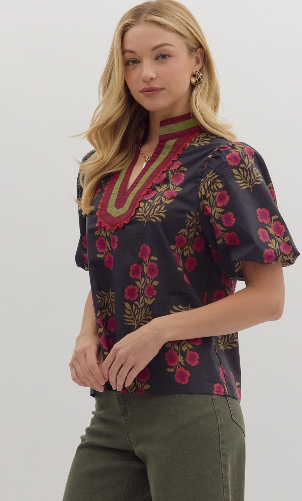 Floral print short bubble sleeve top featuring multicolor accent V-neck band collar. Unlined. Woven. Non-sheer. Lightweight.